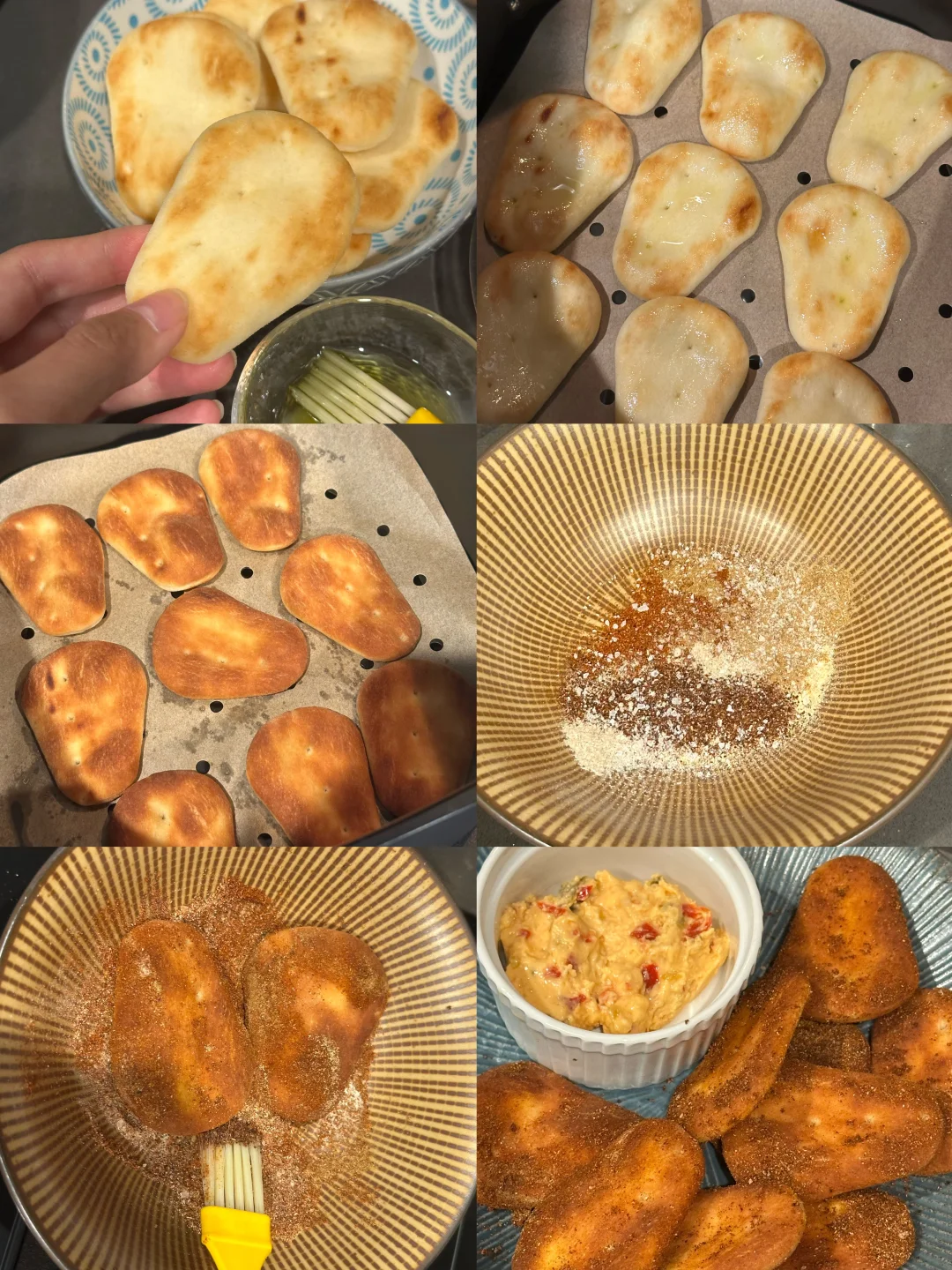 迷你馕两面刷油,空气炸锅350F烤3分钟后翻面烤两分钟;