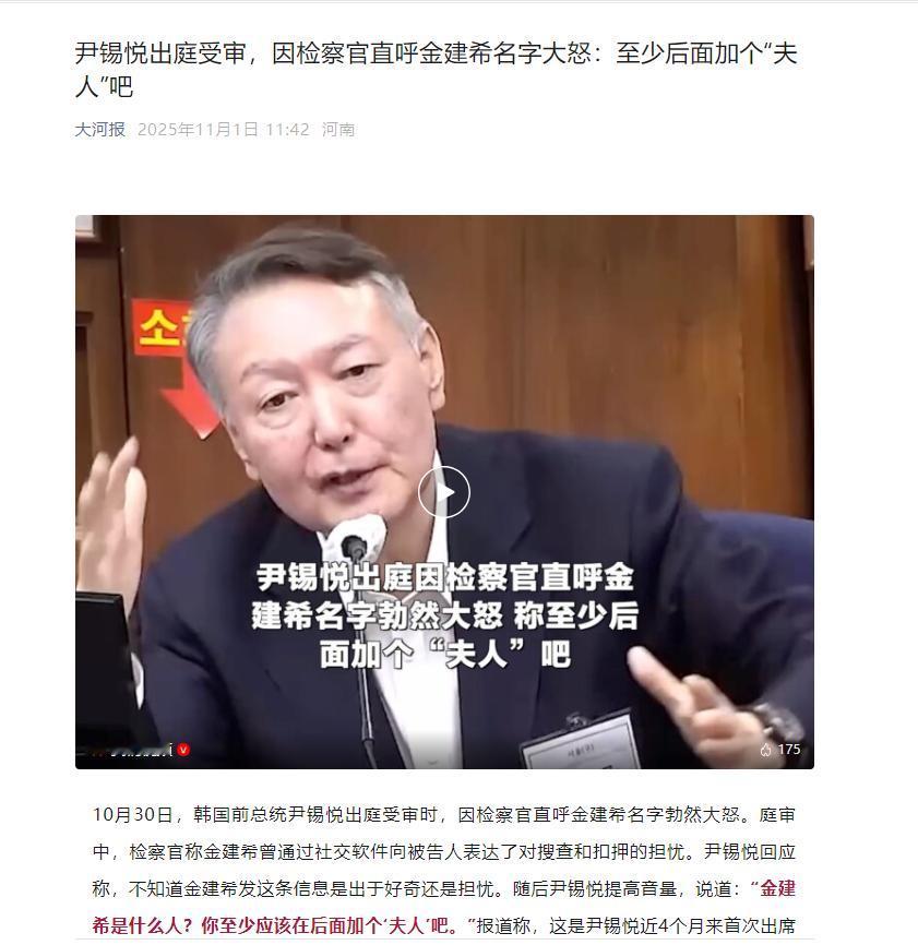 尹锡悦终于忍无可忍了,在庭审时情绪失控,当庭质问检察官:“金建希是什么人,你至少应该在后面加个夫人吧?”万万没想到,尹锡悦被“抄家”忍了,被捕、被拘押都忍了,却因为开庭时,检察官的一句“金建希”,让他破了防。 这份护着老婆的急脾气,跟他以前的做派完全不是一回事。尹锡悦能混到今天,实打实靠着当检察官的硬功夫,在韩国检察系统干了几十年,最会的就是硬刚。当年查大企业的贪腐案,财阀找上门施压,他眼皮都不抬;2022年3月险胜当上总统,靠的就是“专打贪官”这张王牌。 住进青瓦台之后,他把这股狠劲全用在了前总统身上。朴槿惠的贪腐案本来都结了,他一上台就推着重审,硬是把17年刑期加到了20年;另一位前总统李明博的贪污罪,也在他任上添了新罪名,李明博好几次求特赦,全石沉大海。那时候的尹锡悦,在大家眼里就是“没感情的法理机器”,连反对党都得说一句:“他心里只有规矩,没半分人情。” 可这份“铁石心肠”,碰到金建希就全软了。早在他当总统前,政治对手揪着金建希的履历不放,带人抄了他家,搜查的人把书房翻了个底朝天,想找把柄,尹锡悦从头至尾没吭声,配合完只轻描淡写说句“清白的人不怕查”。竞选最关键的时候,他被人告滥用职权,关起来问话,检察官问得咄咄逼人,他也冷静应对,半分没乱。 谁也没料到,扛过这么多政治风浪的总统,会在“称呼”这种小事上失控。但细想下来,这早不是他第一次为金建希出头了。2024年11月,金建希被卷进“收名牌包”“插手朝政”的风波里,在野党还想搞个“金建希特别调查法”,尹锡悦直接开了场全国记者会,125分钟里6次替老婆辩解,说这是“把人往死里抹黑”,还骂特查法是“糟践人权”。那场会他虽然道了10次歉,护老婆的话却一句没松,韩国人都笑称这是“总统级护妻宣言”。 尹锡悦的心思其实特简单,在他看来,金建希是“第一夫人”,这身份不光是面子,更得被人尊重。他自己靠讲规矩当上总统,可到了老婆的名声上,就格外讲感情,别人怎么骂他、攻讦他都行,就是不能对金建希有半点轻慢。这种反差让韩国政坛吵翻了,有人说他“公私不分,把家里事掺进政治里”;也有人觉得,这才露出他铁腕背后的真性情。 有意思的是,尹锡悦以前当检察官的时候,也常直呼别人名字。那时候查案子,对着涉案的大官和他们家人,从来不会特意用敬称,现在却因为老婆的称呼急眼,难免让人觉得他有点双标。但没法否认的是,这场“称呼风波”让大家看明白了,这位靠反贪站稳脚跟的总统,再硬的政治外壳下,也藏着对家人的软心肠。 从铁面检察官到护妻总统,尹锡悦的变化里,藏着韩国政治的乱,也藏着普通人的烟火气。只是他可能没琢磨透,老百姓在乎的不是“金建希”前面加不加“夫人”,而是他当初举着的“反贪大旗”能不能一直扛着,毕竟,当初把他推上总统宝座的,是他守规矩的那股劲,不是一时上头的护妻脾气。