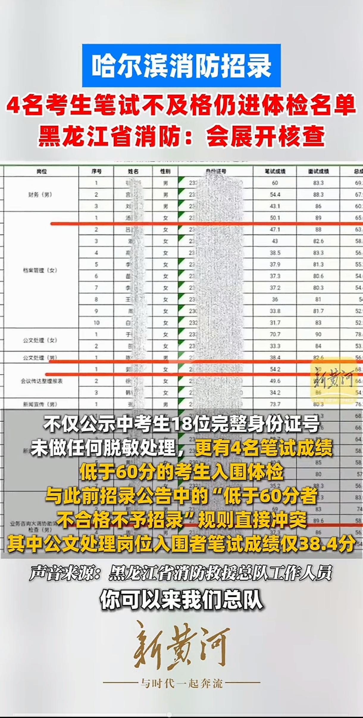 河南的萝卜招聘才道歉没多久,现在哈尔滨的消防招聘也水灵灵得自己掌嘴了 哈尔滨招聘消防官兵。招聘公告里面显示第一轮笔试,第二轮面试,第一轮笔试成绩60分才算合格,不合格者不予录用。 但是竟然有4名60分以下的应聘者进入了体检环节,最低分低至38.4分。 自己写的招聘公告里明确说,低于60分的不予录用,还做体检干什么呢? 如果写这个体检公文的人,审稿的人没有发现这个问题,这么低级的错误都能出,这两个人可以下岗了 如果他们被指示必须这么安排,那么下指示的领导该辞职谢罪。 这种损公肥私的勾当,竟然堂而皇之的公示,哈尔滨是觉得自己脸大吗? 另外,河南那个萝卜招聘的领导,最后怎么样了?