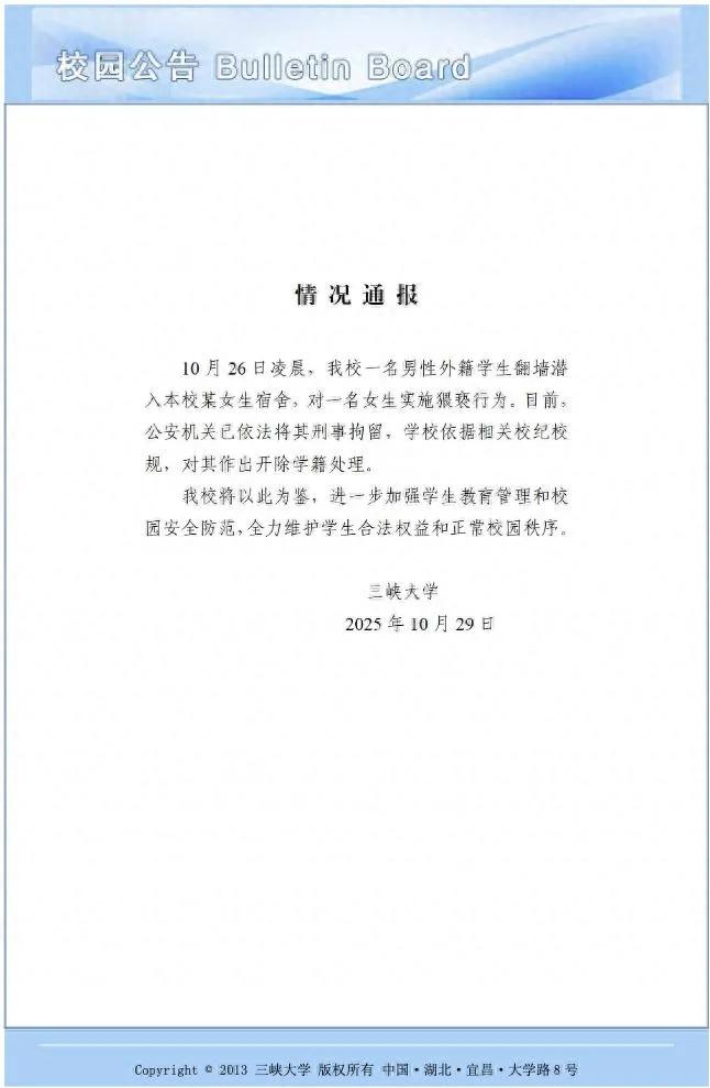 三峡大学男留学生翻进女寝室,真是胆子太大了。 近日,三峡大学多名学生在网络上多两次学校的一名黑人男性留学生,凌晨徒手翻进女寝,涉嫌对女生进行猥亵,学校一直没有公开回应此事,希望学校重视维护女生的安全。 刚开始这件事,很多人都怀疑爆料的真实性,但随着网络爆料越来越多,这件事基本上就确认了,但是学校一直没有回应指示到底有没有追究留学生进行处分和追究责任呢? 10月26日,凌晨2点在湖北宜昌的三峡大学,一场突如其来的惊吓,宿舍里一名女生正在宿舍,却被一阵异常的动静惊醒,一名男性外籍学生竟徒手翻越围墙,攀爬致女生宿舍2楼,悄然潜入一间寝室,黑暗中一个陌生的身影出现在她旁边,对她实施了猥亵行为。恐慌中的女生立刻极力反抗,在挣扎的过程中甚至受了伤,这个外籍学生被当场制服.处理结果很快就出来了,公安机关依法将涉事外籍学生刑事拘留同时学校依据校规,对其作出开除学籍的处理。希望三峡大学能公开这个外籍学生的身份。 本来留学生是来学习性知识的,结果脑子里全是女人,踩完缝纫机出来,估计下一步就是驱逐出境,根据我国的刑法,情节严重可能判5年的有期徒刑,这名外籍留学生,不管你是哪国人,只要犯了法,该刑拘就刑拘,该驱逐就驱逐,没有特殊待遇.成绩再好,品德不行.来中国留学就得尊重中国的规矩.