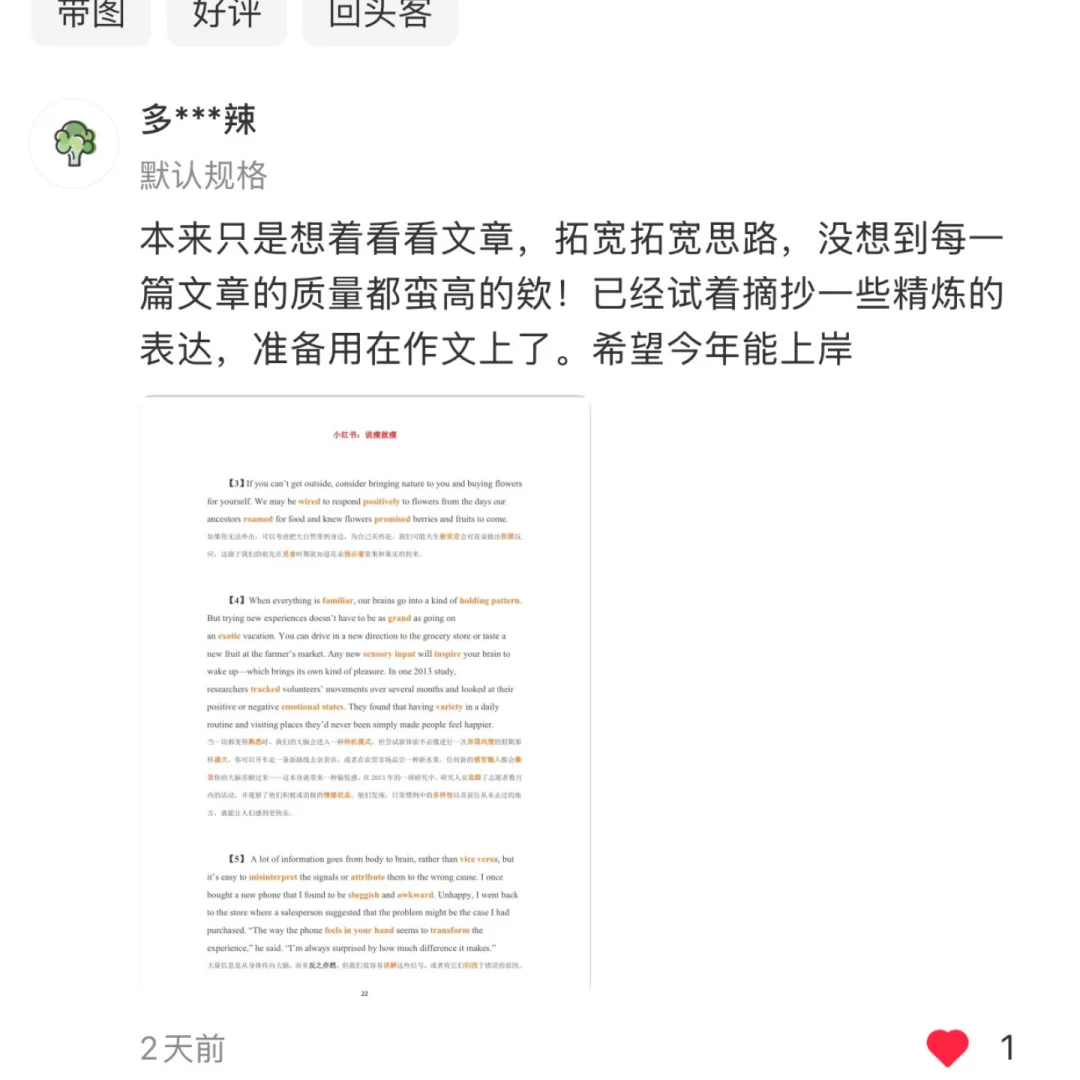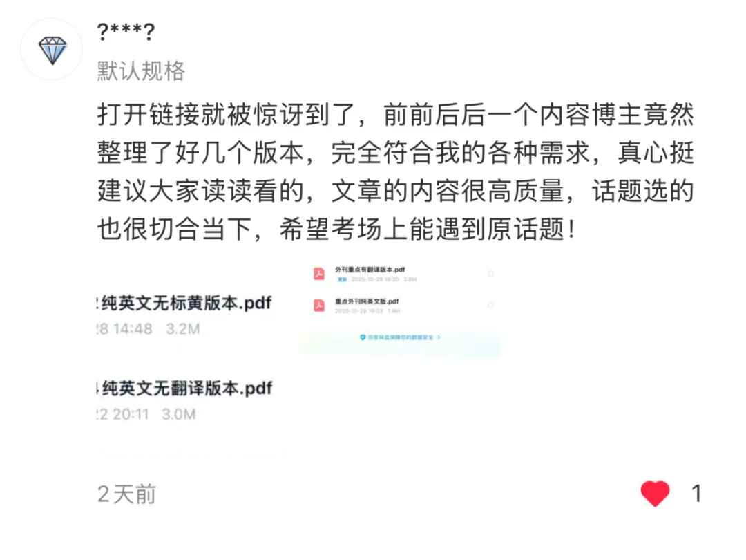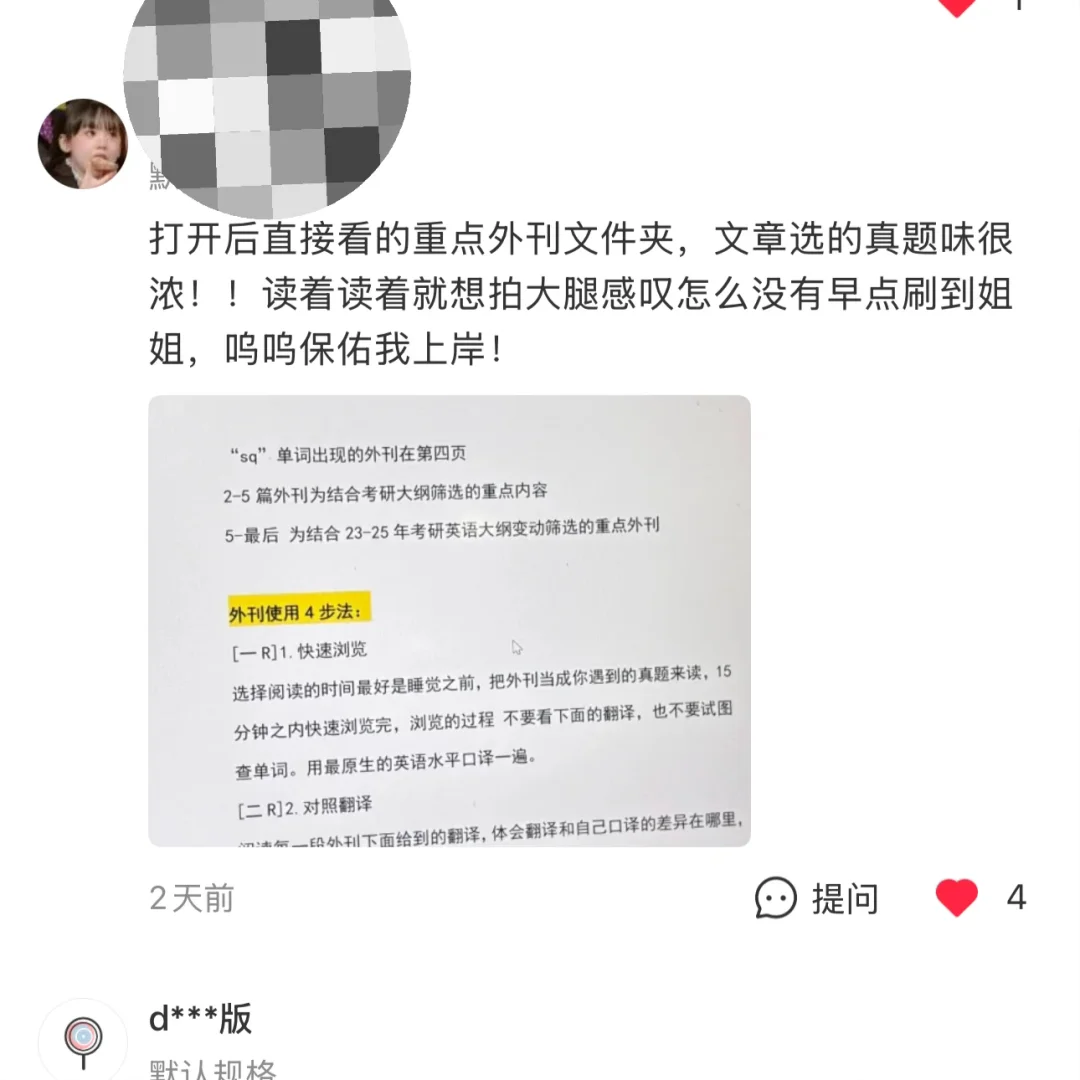 大家的信任,让我感受到前所未有的责任感。请大家放心,考研的时候,我也是从夏到冬备考了大半年,我清楚你们的焦虑和无助,因此,大家对这份外刊资料的建议意见,只要我能做到,我会尽我所能地帮助大家。