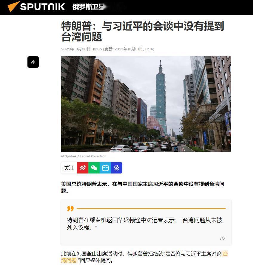 特朗普谈台湾问题了!11月3日,根据外媒报道,特朗普在接受哥伦比亚广播公司(CBS)采访时表示,10月30日在韩国釜山面对面会谈时,完全没有提到台湾问题。被问及如果大陆对台湾采取军事行动,他是否会下令美军介入,特朗普说:如果真的发生,你们到时就会知道,他是心里有数的。我不能泄露我的秘密。另一边知道答案。 先说说釜山会谈为啥不提台湾,这哪儿是忘了啊,明显是故意的!台湾从来就不是美国外交的重头戏,顶多就是个用得上就拿出来,碍事儿了就扔一边的筹码。10月30号那回中美元首见面,特朗普心里门儿清重点是啥,两边刚说好了取消10%的芬太尼关税,24%的对等关税也延长暂停一年,经贸团队之后还得接着谈合作呢。 这时候要是扯台湾,轻了让谈判气氛变僵,重了直接把这些实实在在的好处搅黄了,特朗普才不做这种捡芝麻丢西瓜的蠢事呢。对他来讲,协调地区安全、搞经贸合作这些才是“正经事”,台湾问题要是挡路了,先放一边太正常了。 其实这也不是头一回了,特朗普对台湾的态度,从来都是看有没有好处才决定咋做。之前他聊中美贸易的时候,随口说了句“这对统一有好处”,把赖清德那帮人吓得赶紧去问美国,直到美国出来“解释清楚”,他们才敢松口气。 还有今年2月,他刚上台不到一个月,就偷偷把国务院网站上“不支持台独”的话删了,后来台湾前官员都看明白了,说这“不是给台湾看的,是给大陆看的”,说白了就是拿台湾当筹码,跟咱们讨价还价。美国的小算盘从来没改过:用得上台湾的时候就把它捧得高高的,真要跟咱们谈核心利益了,立马就把它扔一边。 再看他被问到美军会不会插手时那套“神秘说法”,“我心里有数”“不能泄露秘密”“对面也知道答案”,这哪儿是什么真有好办法啊,就是典型的“不说死”的套路。美国对台湾的政策,几十年都玩这套,不说“保台湾”也不说“不保”,就是为了多捞好处,不说保,是怕台湾瞎折腾闯祸;不说不保,又怕咱们推进统一。 特朗普这招把“不说死”玩到顶了,既不能把话说死得罪咱们,毕竟刚在经贸上拿到好处;又得安抚台湾和美国国内那些好战的人,所以故意装出“我早有打算”的样子,给自己留好退路。 而且他这套“装神秘”的套路也不是第一次用了,之前聊俄乌停火的时候,还拿冰球裁判打比方,说要“让两边先打一会儿再插手”,结果转头说法就变了。这次聊台湾问题也是这样,“对面知道答案”听着挺吓人,其实就是他清楚咱们在台湾问题上的底线绝不能碰,不敢真把话说死,不然之前谈好的经贸事儿说不定就黄了。 说到底,特朗普所有的说法,都离不开“美国利益最重要”这六个字。美国嘴上喊着“支持台湾”,其实早把台湾的命运当成了谈判的筹码,之前甚至有美国政客明着说,万一台湾有事就“炸了台积电”,根本不管台湾老百姓的死活。可台湾当局还把希望放在这种“只看好处”的支持上,这本身就是条死路。 不管特朗普怎么耍滑头、玩“不说死”的套路,有一点永远变不了:台湾是中国不可分割的一部分,这是全世界都认的理,更是历史的大趋势。 美国想拿台湾当工具搞“用台湾牵制中国”,特朗普想靠“不说死”两边讨好,最后肯定是白费劲。毕竟筹码再好用,也改不了主人对自己家地盘的主权,更拦不住两岸统一的必然结果。