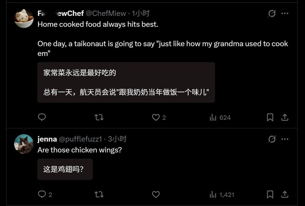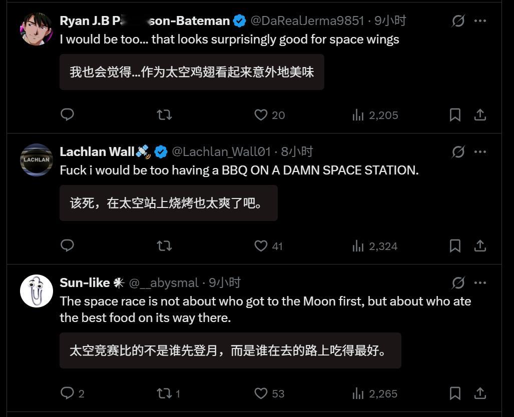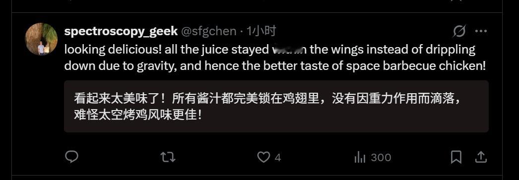 🔹“看起来太美味了!所有酱汁都完美锁在鸡翅里,没有因重力作用而滴落,难怪太空烤鸡风味更佳!”