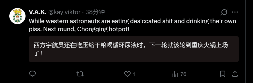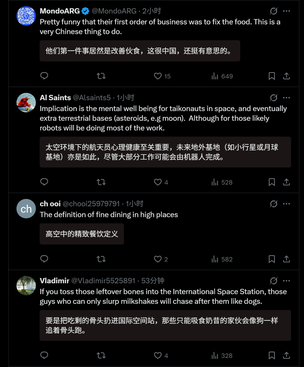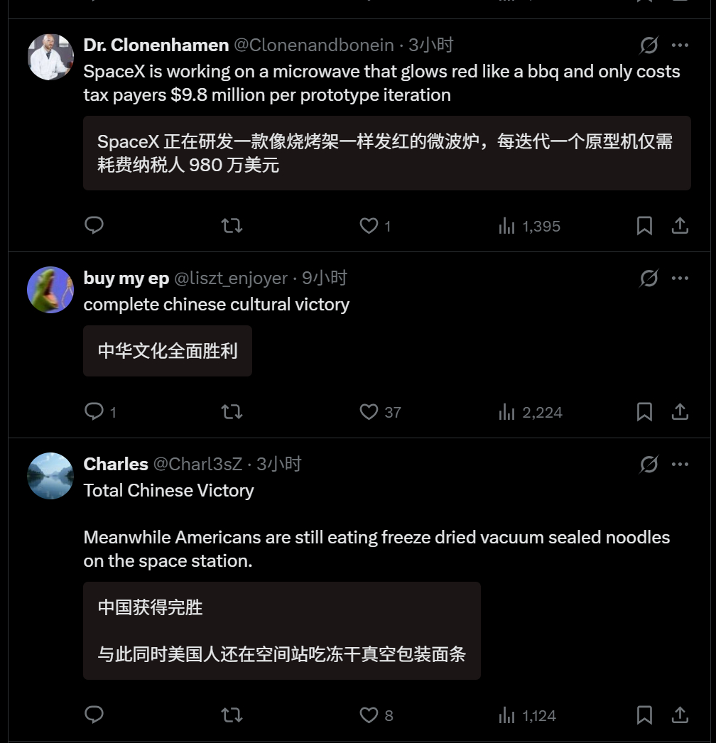 🔹“中国获得完胜,与此同时美国人还在空间站吃冻干真空包装面条”
