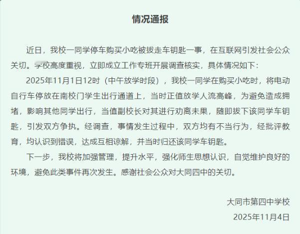 “好大的官威啊!”近日,山西大同,女生在校门口买吃的,工作人员将其电动车钥匙拿走!女生哭着求工作人员还给自己,工作人员却说:“看我给不给你……”网友:学校的工作人员,有抢夺学生财物的权力了吗? “你看我给不给你……”谁能想到,这句因一时生气脱口而出的“威胁”,竟然闹上了网络。事情的经过并不复杂,在山西大同四中校门口,一个女生哭着哀求工作人员归还被没收的电动车钥匙,对方冷漠的神情与女生无助的哭泣形成了刺眼的对比。 根据校方后续通报,这起事件的起因是:女生为了买小吃,将电动车停放在学生通行通道上,影响了放学时段的交通秩序。副校长在劝离未果后,才采取了拔钥匙的方式。 这本该是一桩三十秒就能解决的小事。学生挪开车,副校长提醒两句,事情就过去了。可现实却是:钥匙被拔,学生被急哭,副校长拒绝立即归还,整个过程在众目睽睽下上演了。 之所以会闹大,是因为当合理的秩序维护遇上了不当的执行方式,原本占理的一方反而变成了理亏。副校长维护通道畅通的初衷无可厚非,但当他把钥匙攥在手里、面对学生的哀求说出“看我给不给你”时,事情的性质就从维护秩序变成了展示权威。 几乎每个读过书的人,都曾在校园里遇到过类似的场景。 食堂里打饭的阿姨,给熟人总是多打一勺菜;学生会的纪检员,检查纪律时格外严厉;宿舍管理员,对顺眼的学生网开一面……这些看似微不足道的权力,在特定的环境里被放大成影响学生日常的重要因素。 大同四中这位副校长的行为,某种程度上可以说是这种“小权在握”心理的极端体现。他可能觉得自己在履行职责,但在学生和旁观者眼中,这种拒绝归还钥匙、让学生苦苦哀求的行为,已经超出了正常管理的范畴。 好在,根据通报,经过学校批评教育,双方都认识到自身行为的不当之处,并互相谅解,钥匙也已经归还。 这个圆满的结局背后,却让有些网友发出疑问:如果没有视频曝光,如果没有网络舆论的压力,这件事还会以“互相谅解”收场吗? 网友们愤怒的,并不是学校维护秩序本身,而是那种居高临下的态度,那种把管理变成惩罚的做法。 在现实生活中,类似的情况比比皆是:物业保安对业主颐指气使,窗口办事员对群众爱答不理,小区管理员对住户呼来喝去……这些日常生活中的“微权力”运行失范,往往比那些遥不可及的腐败更让人感同身受。 大同四中这件事之所以引发强烈共鸣,正是因为它触动了无数人心中那个“被权力伤害过”的敏感神经。很多人都曾是那个学生,在某个场景下,面对着一个手握小权却毫不留情的人。 但值得欣慰的是,很多网友在了解完整经过后都觉得,学生的违规停车固然有错,但工作人员的处理方式更需要改进。这种就事论事的态度,正是我们社会最需要的理性精神。 毕竟,教育的本质从来不只是管束,更是引导。一所优秀的学校,不仅教会学生知识,更要用正确的方式教会学生规则。而这个“正确的方式”,一定是以相互尊重为前提的。 希望下一次,当类似情况发生时,我们听到的不是“看我给不给你”,而是“下次请注意”。 信源: 极目新闻2025-11-04 ——大同四中通报“拔车钥匙事件”:学生买小吃停车堵通道,副校长拔钥匙引争执,双方已认错和解 文|一阳 编辑|史叔