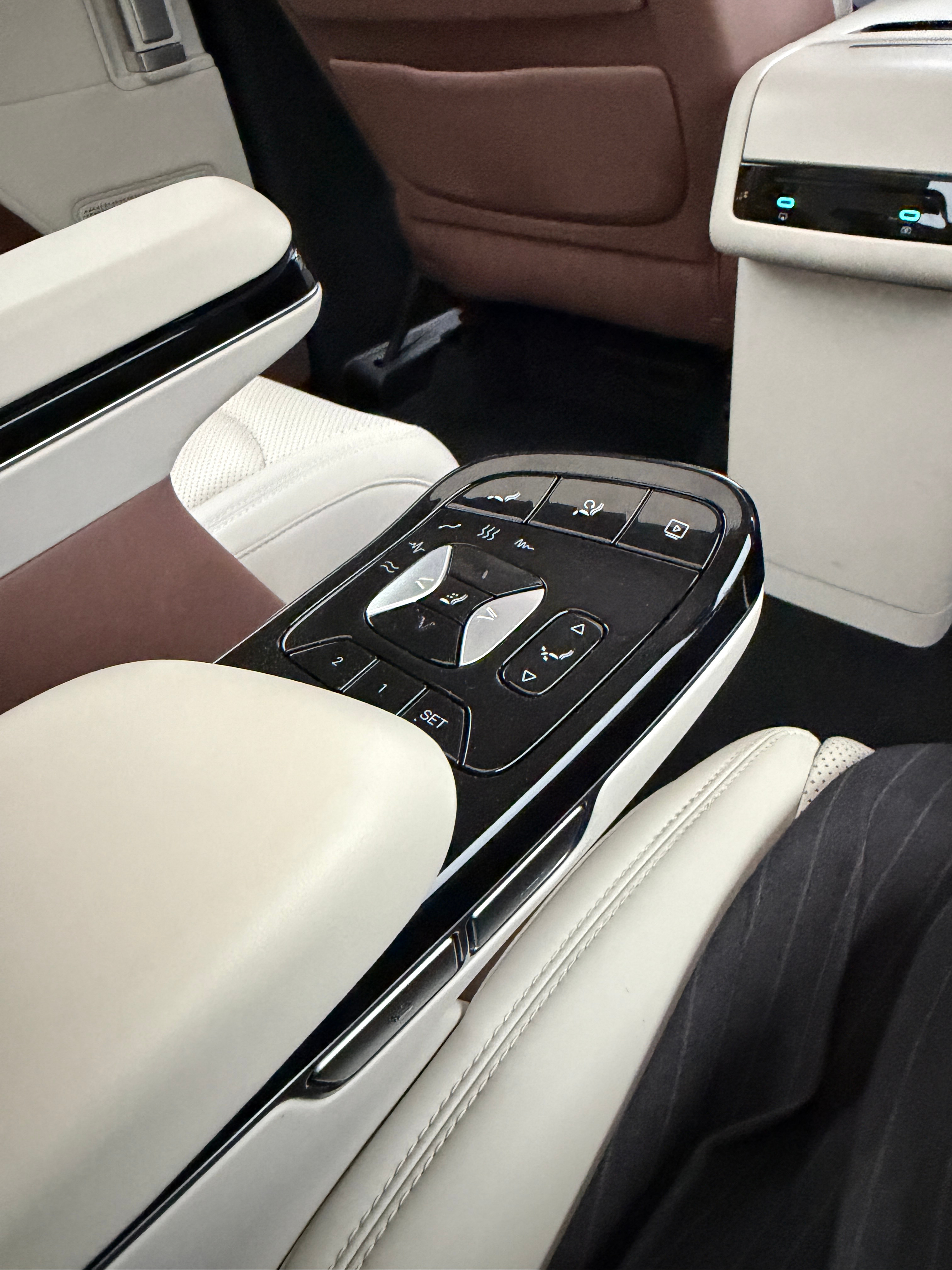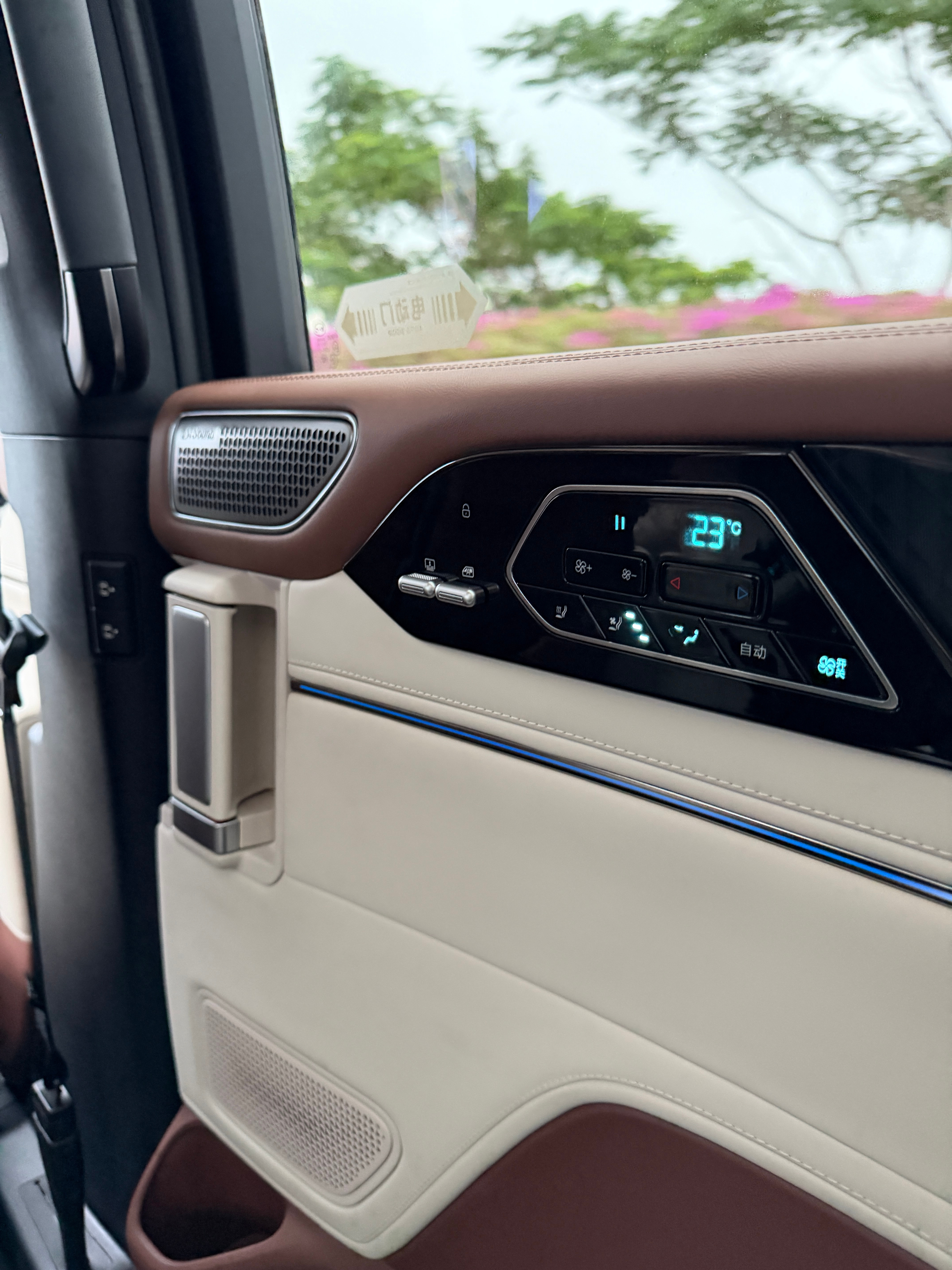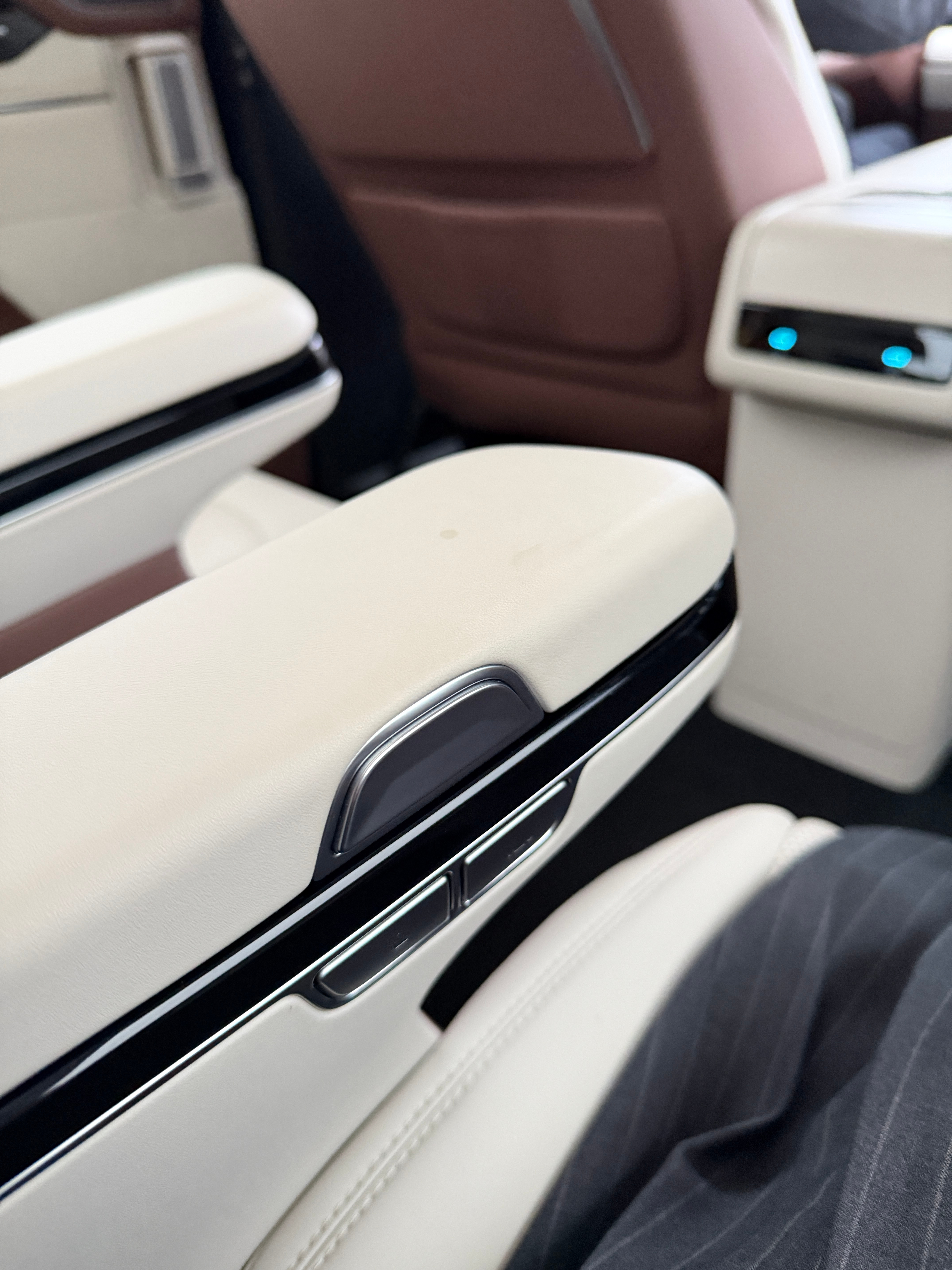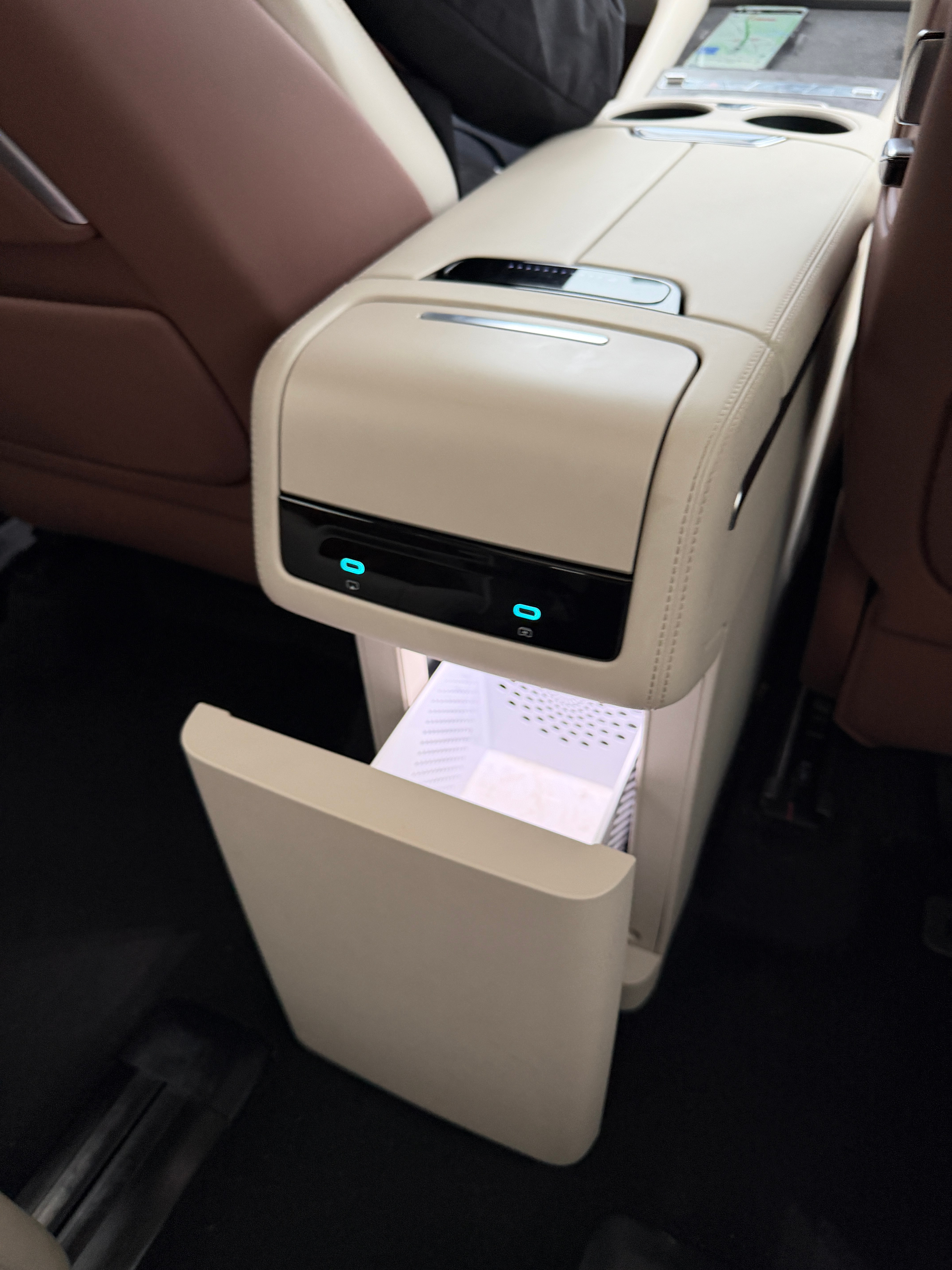 给大家看看内饰细节,双零重力座椅,通风、加热、按摩等功能一应俱全,智能冷暖冰箱还可以通过扶手按键电动打开,吸顶娱乐屏、折叠小桌板、后排全景天幕+遮阳帘等等…