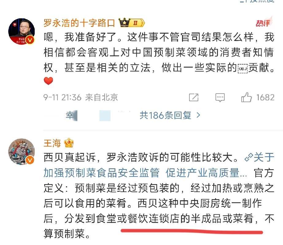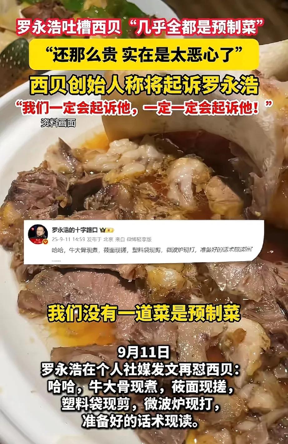 官司还没打 王海已经预测罗永浩要输了 事情起因,老罗去西贝吃了顿饭,吃后吐槽全是预制菜又贵 西贝老总一听,生气了 觉得你作为一个名人,这样说,对他的品牌影响很坏,并且否认自家是预制菜,一定会对他进行起诉 老罗也表示准备好了打官司 正当网友猜测双方谁赢谁输时 打假的王海则表示 老罗大概率会输! 因为西贝是中央厨房统一制作然后分发半成品菜肴,以现在对预制菜的定义,这做法不算预制菜 所以老罗这次可能要输 这两人互掐也引起广大网友对于预制菜的讨论 客观上的确促进了消费者的知情权 只是对这个定义,大家也各有看法
