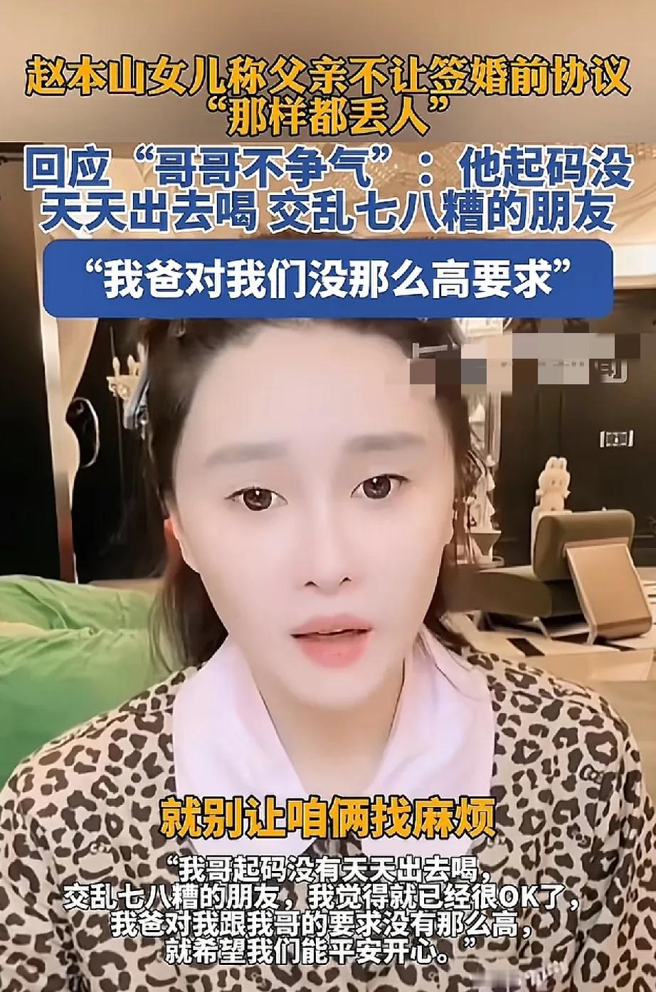 赵本山是个有智慧的人 对自己儿女看得非常透彻 近日赵本山女儿回应网上的一些言论 谈及网上说她哥哥不争气之类的 她很淡然 表示赵本山从小就对她跟哥哥要求不高 就是不惹麻烦 其实赵本山也多次在采访节目上 谈过子女教育 一不希望孩子接自己衣钵 二不希望孩子瞎折腾 说白了平安健康就行了 自己孩子是龙是虫 赵本山门儿清 是龙有了机会自会出来 是虫硬抬上去是要出事的 所以如今他的子女这个状态挺好的 不需要多大成就 不惹麻烦就行了 那些整天望子成龙,望女成凤的 本身自己就不是什么龙凤 总纠结子女得干出多大的成就来 何必呢 老赵这就心宽 多大能耐干多大的事 而不是说你是赵本山儿子 就必须青出于蓝而胜于蓝