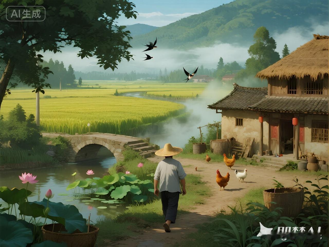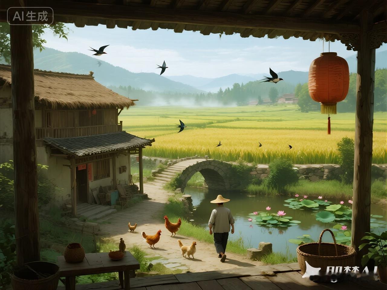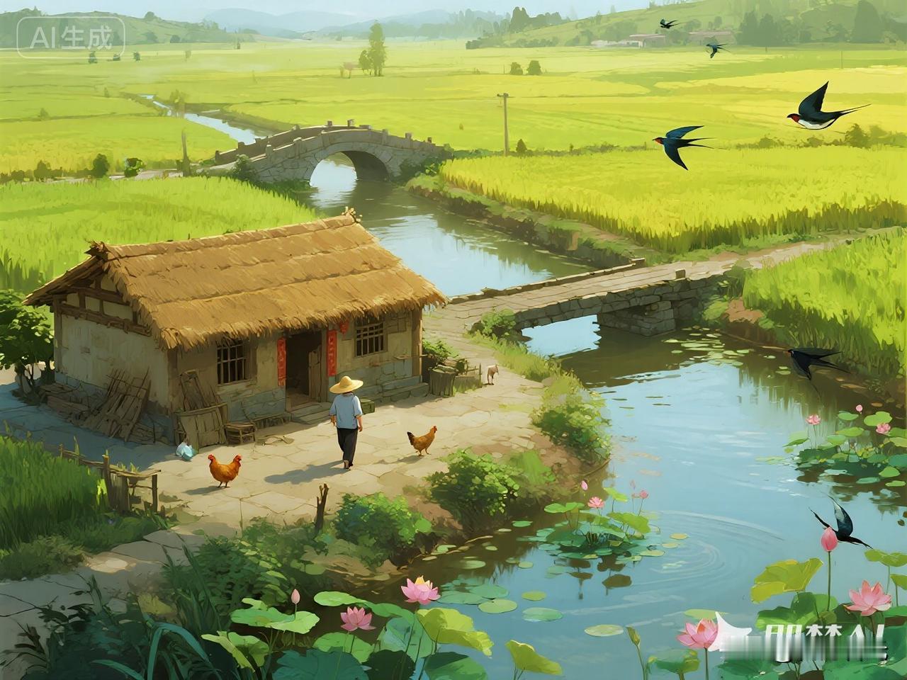 鹧鸪天·乡村风景好 麦陇风摇绿浪平,溪桥烟锁燕雏轻。 茅檐日暖鸡豚乐,竹院春深犬吠宁。 荷叠翠,柳含情,田夫荷笠趁新晴。 桑麻满目皆生意,不羡人间万户荣。 (凭栏远眺,似见田畴阡陌间生机流转,嘴角漾起恬淡笑意 )上阕绘田野风光:麦浪翻涌如绿绸,溪桥烟霭中雏燕轻飞,茅檐下鸡豚相逐,竹院里犬吠悠然,尽是乡居闲趣。下阕写田园生机:荷叶叠翠,柳丝含情,农夫戴笠趁晴耕作,桑麻遍野充满生机,这般景致远胜人间荣华,道尽对乡村风光的倾心。