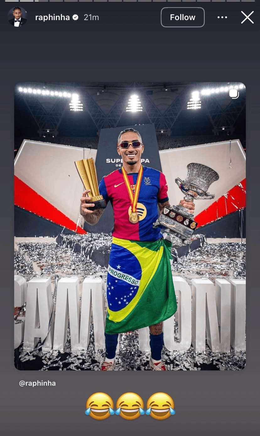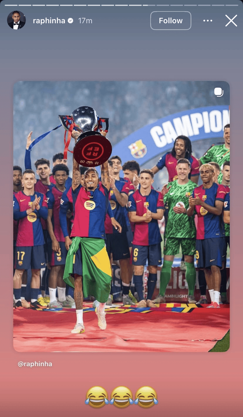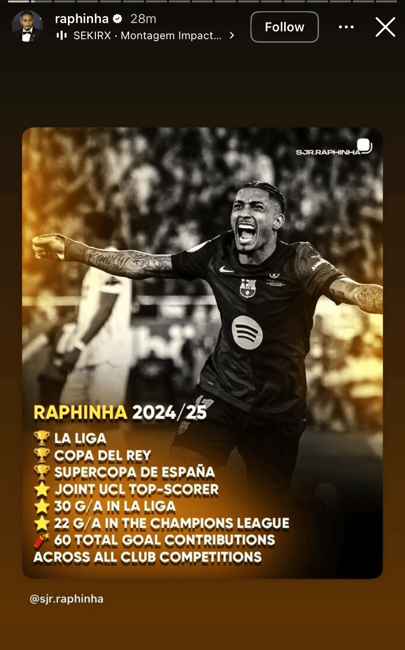 上赛季,拉菲尼亚代表巴萨在各项赛事出战57场比赛,打进34球送出22次助攻。帮助俱乐部拿下了西甲冠军,国王杯冠军,西班牙超极杯冠军。