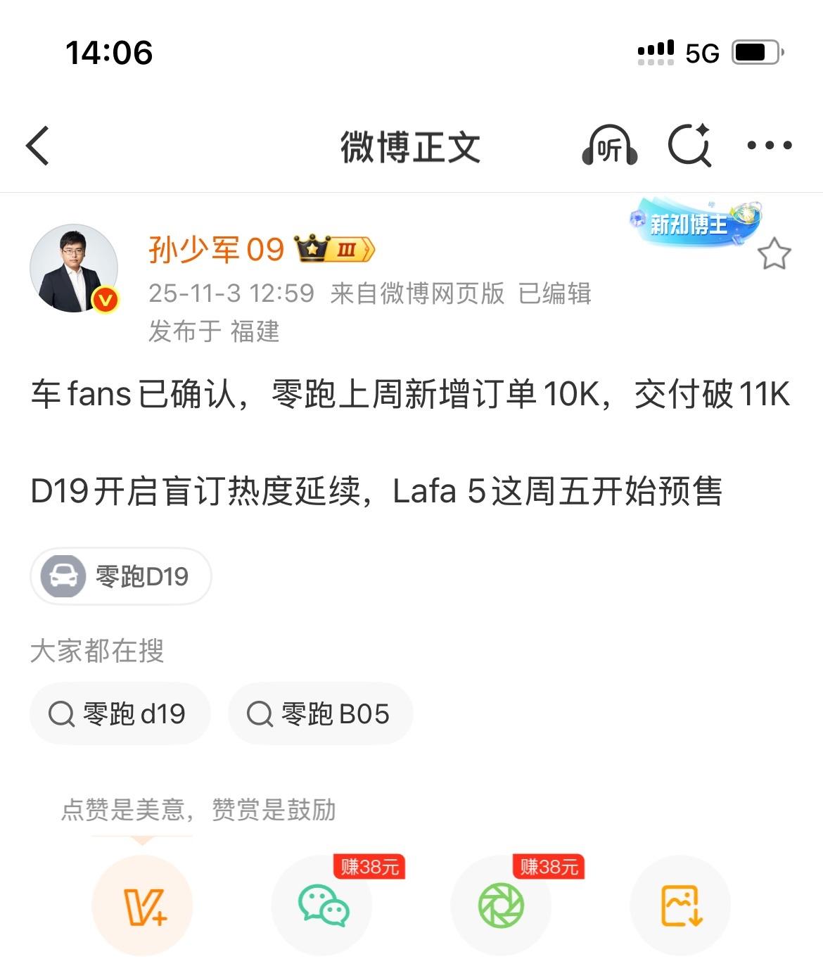 11月销量有望再次提升?零跑最新一周销量继续领跑新势力。 10月交付70289台,继续领跑新势力,刷新了自己所创造的新势力历史月销纪录。而且这高光表现进入到11月后依旧在延续,上一周,零跑交付超1.1万台、新增订单也继续破万,加之前几周其单周交付比订单还多,说明零跑其实还有不少锁单在手、可以在未来持续消化,冲着这良好势头,我看11月再破一次月销纪录也不是不可能。 其实就目前零跑的布局来看,它已经不单单是要在国内保持稳步向上。在过去两年,零跑已有多款全球车在欧洲完成首发,除了海外累计交付超2万台零跑C10外,今年亮相慕尼黑的零跑B10,不仅在10月达成了9663台单月交付量,更已经于不久前在海外上市开售。 而且最近这段时间,B10正在进行全球媒体试驾,就连见过大风大浪的欧洲媒体都对它进行了大篇幅报道、对它的质价比感到不可思议。此外,B10目前下定即享四项终身免费质保+至高价值19000元限时礼遇,这月销数据肯定还有得涨。 通过十年全域自研的坚持,零跑不仅在产品上兑现了越级的体验与科技平权,更通过核心技术的掌握持续扩大规模效应,就连海外布局都是连战连捷。加上现在还有双十一的9000元的购车礼遇,别说是11月国内月销破纪录了,零跑就是代表中国新能源去冲一冲海外的什么纪录,我都不会感到意外。#造车新势力##零跑汽车#
