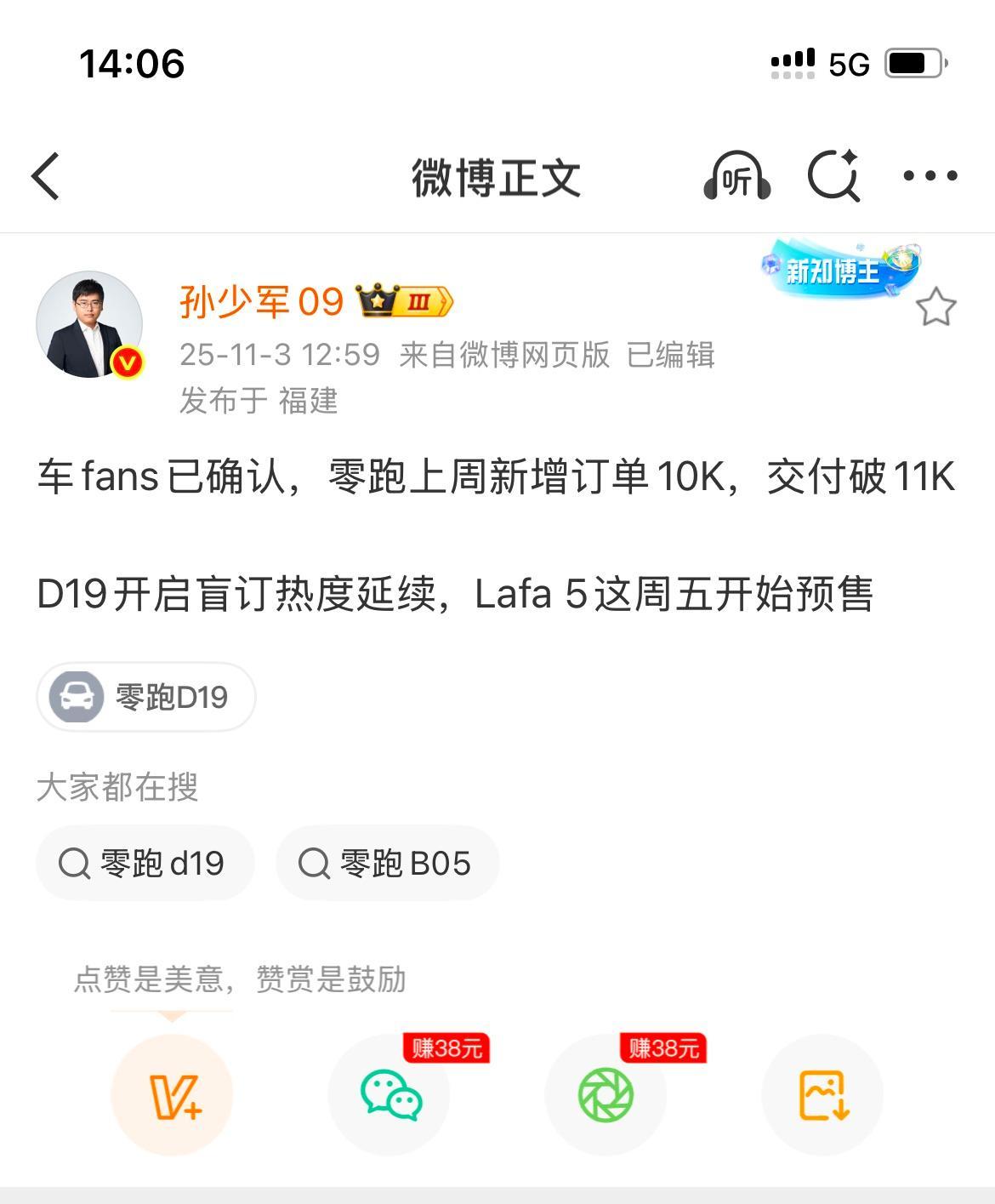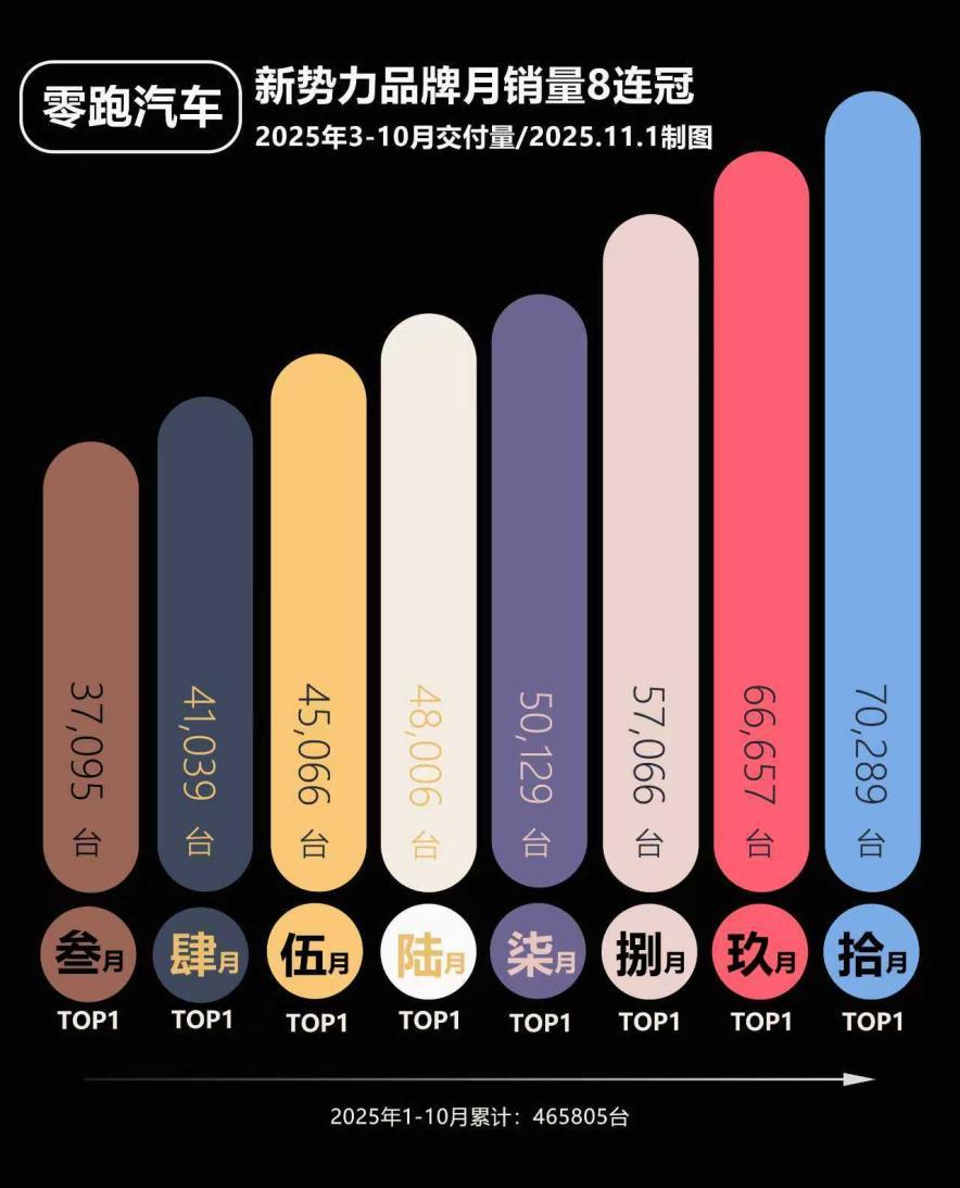 周交付和订单继续双双破万,零跑表现太稳了! 交付新车11K,新增订单10K,零跑上周的销售表现,依旧抢眼,不过我想更让大家惊讶还得是上个月的销量数据,零跑10月交付新车70289万台,再次刷新新了势力品牌的交付历史纪录,连续8个月领先中国新势力。 可以说从今年3月开始,零跑每个月都在刷新自己的月销纪录。而且在最近的周销量中,零跑几乎每周都能做到稳定交付过万和订单过万,甚至做到了交付大于订单,而这背后反应的是零跑充足的订单储备,以及高效的工厂和供应链效率在做支持。 回想2019年零跑创始人朱江明接受采访时表示,25年要卖50万台并实现盈亏平衡。当初很多人都在嘲讽这“牛吹大了”,可如今这个“牛”真的要实现了。现在距离25年结束仅剩2个月,零跑今年的累计销量已经来到46万,在充足订单和稳定交付的加持下,今年完成50万的年销目标应该没有任何问题。 再说了零跑现在的产品依旧有很强的市场号召力,如C11,10月份销量1.1万,累计销量已经29万,而且全新C11上市后产品力全面提升,绝对是家庭用户购车的首选。临近双十一,零跑还有至高9000元置换补贴等购车福利,这也将进一步带动零跑的销量,我们就拭目以待零跑今年最终的表现吧! 零跑汽车 零跑C11