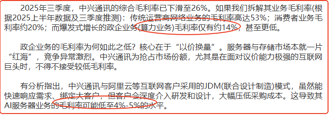 这里补充一个观点:因为我国大搞AI+,实际需求确实不弱,但毛利水平是很难养出“易中天”这种级别的利润的。严格上说液冷、CPO这类产品本身技术门槛并不高,国内市场很容易卷价格,因此有需求未必赚钱。这也是个挑战,如中信通讯三季报中AI算力服务毛利仅为“14%”,并因为和“互联网巨头竞争”可能继续降低到“4%-5%”。