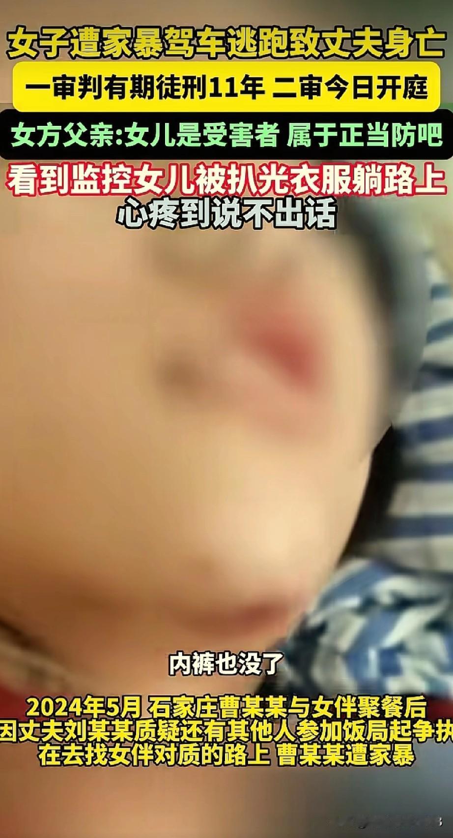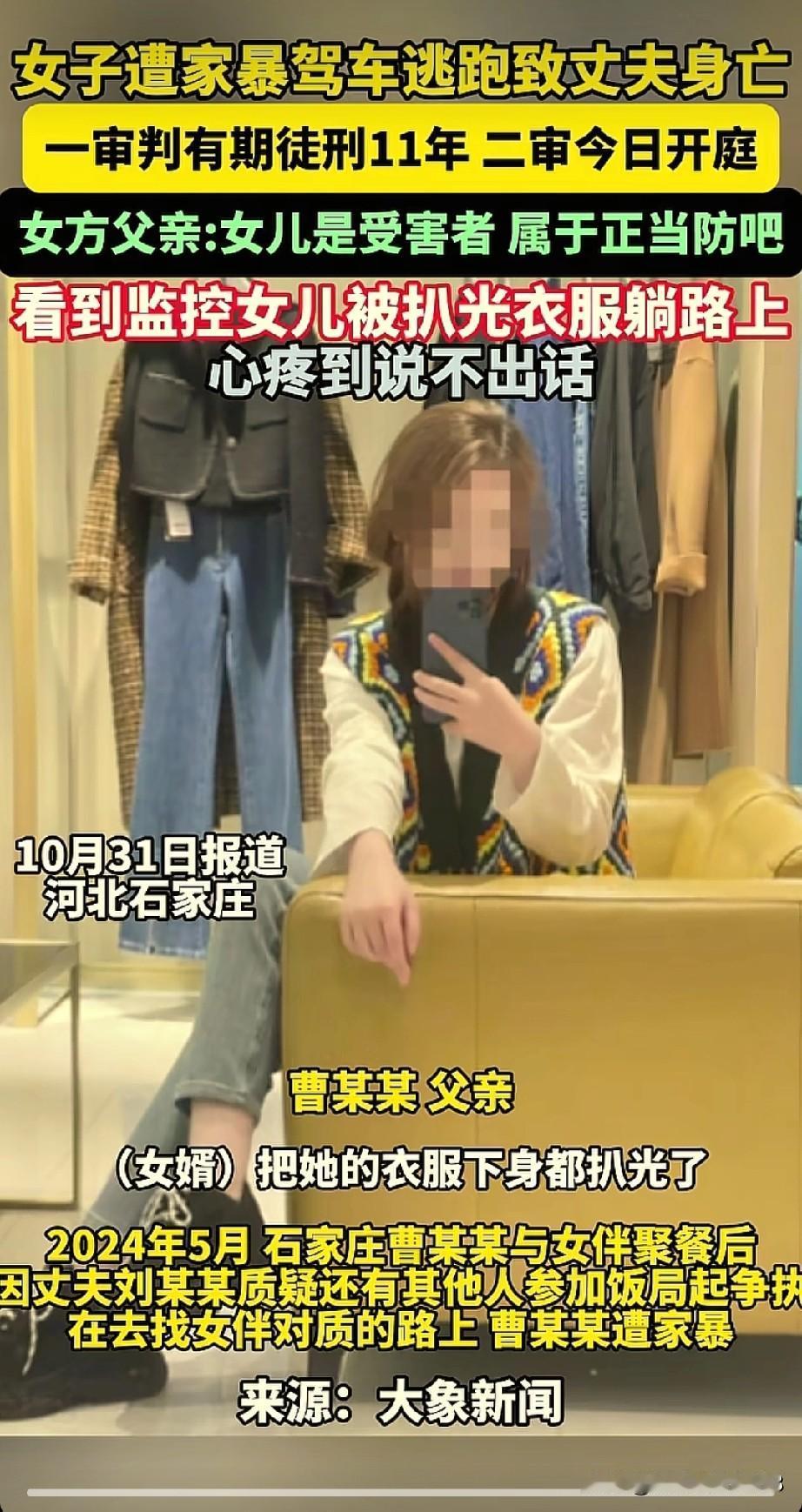 河北曹某某的父亲说,他在监控上看到女儿被扒光衣服,在大马路上被打的趴在地上都不动了! 我相信曹某某当时没有杀人的故意,她只是想逃命,应该属于紧急避险的情况。 试想一下,当时曹某某的丈夫刘某某手持尖刀,威胁着要杀了她,而且在这期间,已经对曹某某实施了长时间的殴打。曹某某被打的命都快没了,又被扒光了衣服,这种情况下,曹某某还能有啥别的念头,她只能想着赶快逃命啊! 而刘某某在这种情况下,趴上车头的引擎盖,阻止曹某某离开,如果曹某某当时停车了,肯定又会被刘某某毒打一顿,甚至很有可能真的就没命了! 大家说在这种情况下,曹某某敢停车吗?