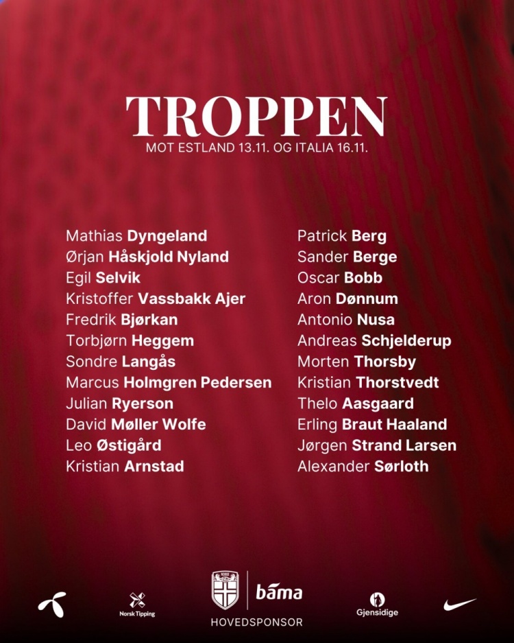 中前场:阿恩斯塔德(奥胡斯)、帕特里克-伯格(博德闪耀)、桑德-博格(富勒姆)、鲍勃(曼城)、冬纳姆(图卢兹)、努萨(莱比锡)、谢尔德鲁普(本菲卡)、托斯比(热那亚)、托尔斯特韦特(萨索洛)、阿斯高(流浪者)、哈兰德(曼城)、拉尔森(狼队)、瑟尔洛特(马竞)