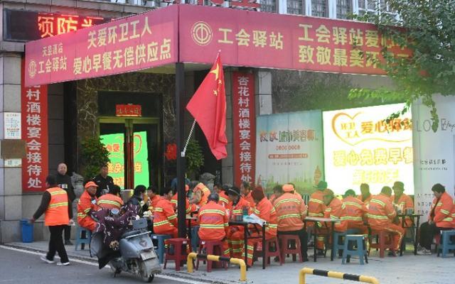 利辛县总工会在一次调研中发现,城区近七成环卫工人因工作时段早、收入有限,存在不吃早餐或随便应付的情况,一些人因此患上胃病。2024年初,利辛县总工会开始牵头对接爱心企业,试点设立“关爱环卫工人爱心早餐无偿供应点”,利辛县天昱酒店就是首家响应的爱心企业,酒店将为宾客准备的早餐做多一些,无偿提供给周边的环卫工人吃。