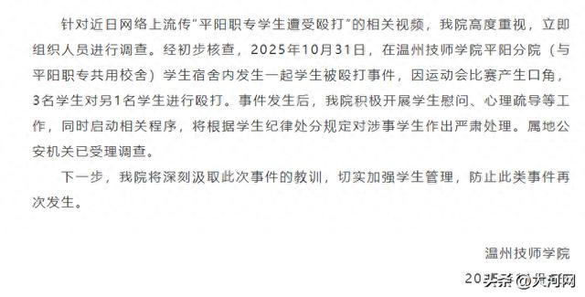 针对近日网络上流传“平阳职专学生遭受殴打”的相关视频,我院高度重视,立即组织人员进行调查。经初步核查,2025年10月31日,在温州技师学院平阳分院(与平阳职专共用校舍)学生宿舍内发生一起学生被殴打事件,因运动会比赛产生口角,3名学生对另1名学生进行殴打。事件发生后,我院积极开展学生慰问、心理疏导等工作,同时启动相关程序,将根据学生纪律处分规定对涉事学生作出严肃处理。属地公安机关已受理调查。