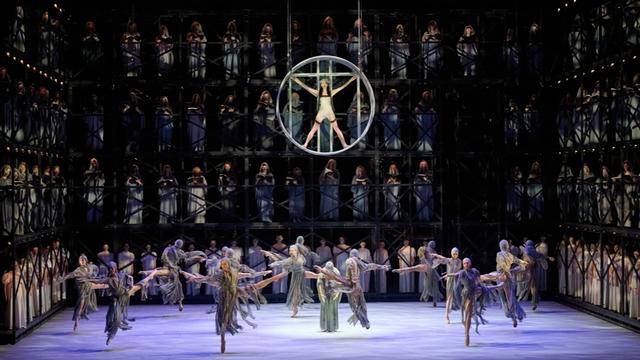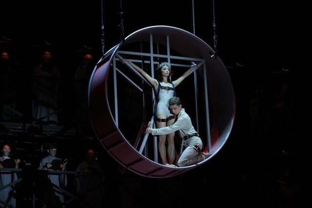 视觉上,这部作品更是“诚意拉满”。卫承天兼任布景设计,用8米高的环绕式高台还原修道院的氛围,上海音乐学院合唱团与上海市黄浦区青少年艺术活动中心春天少年合唱团的成员将层层站在高台上,与台下的香港管弦乐团呼应;舞台中央的高空中,一个轮盘悬挂着,舞者伸展四肢站在其中,宛如达芬奇《维特鲁威人》的复刻——这既呼应了《哦,命运》里的“命运之轮”,也像主角“奥兰多”一生追逐的、遥不可及的“天使”。