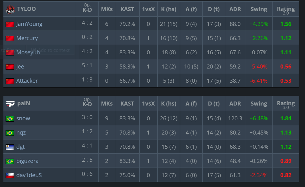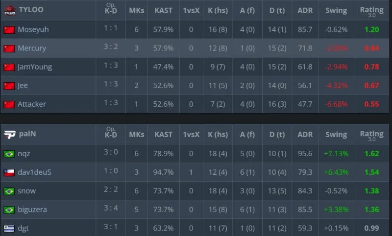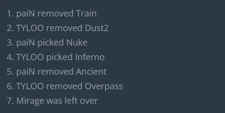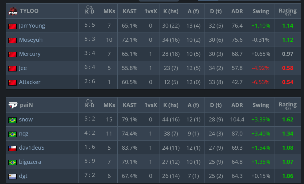 开局为CT方的TYLOO化解paiN进攻,moseyuh三杀帮助TYLOO拿下手枪局,paiN强起失败被迫进入经济局,开局TYLOO建立3-0的领先优势。第五局,dav1deuS开场双杀破解外场防守,TYLOO保枪失败,被迫进入经济局。进入经济局,Jee外场先拿下人头,在人数优势情况下,TYLOO在枪械劣势情况下拿下经济局。第八局paiN被迫半起,开局策划铁板攻势,jee抽掉一人后被补,TYLOO回防B区失败,paiN拿下半起局。第十局TYLOO的B区再次失守,TYLOO保枪失败。随后paiN接连取分,将比分反超至5-7进入下半场。