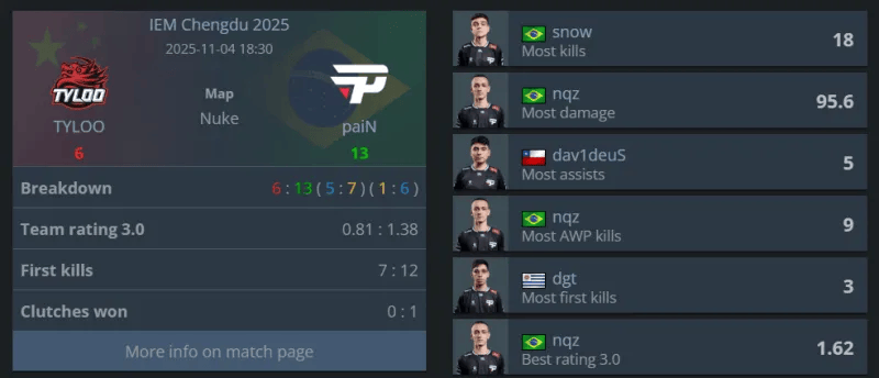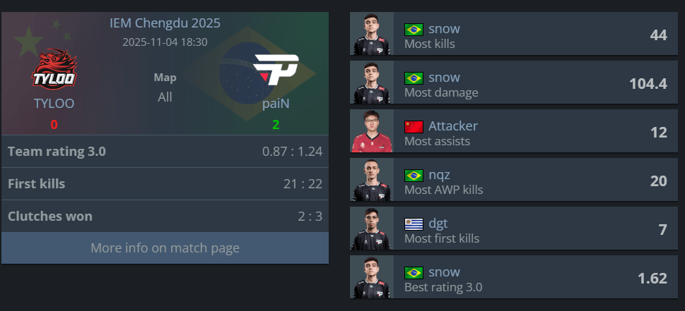 虎扑11月04日讯IEM成都败者组,TYLOO对阵paiN结束,TYLOO0-2paiN:发挥失常!TYLOO遗憾告别IEM成都