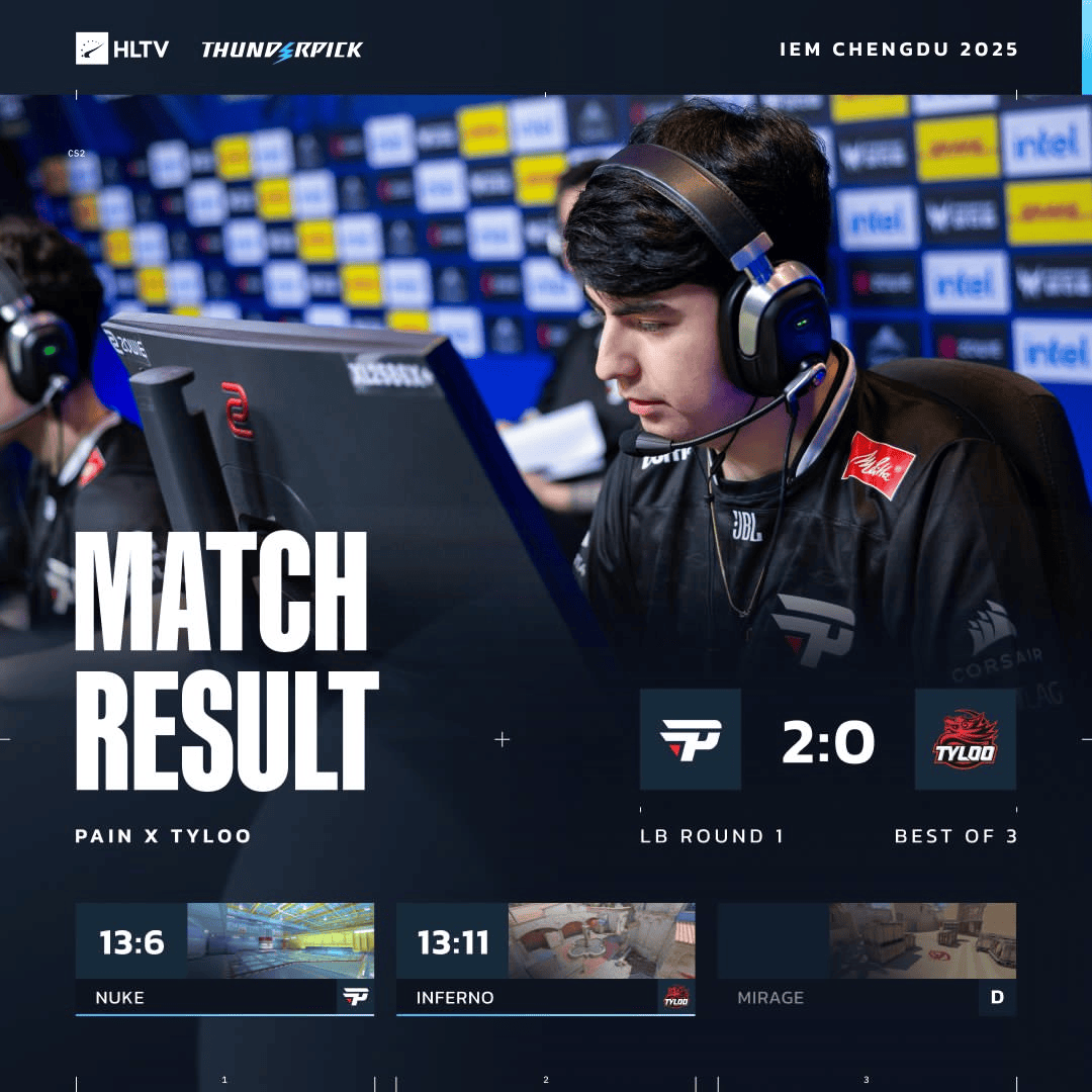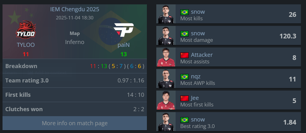 下半场易边再战,paiN中路默认后选择进攻A区,A2楼和连接失守情况下,TYLOO拿下三打五残局成功回防拿下手枪局。第十四局paiN选择半起,中路集合A区成功破解TYLOO防守,TYLOO人数劣势情况下被迫保枪。但TYLOO迅速调整,在B区成功接住paiN攻势,随后成功将比分反超至10-8,paiN叫出暂停,暂停回来paiN先丢一局后接连取分,比分逼近至11-10。第二十一局,paiN中路获取信息,小菊不慎树位掉点,paiN取得人数优势后进入蕉道,moseyuh被迫单B,paiN顺利进入B区,TYLOO直接保枪比分重回同一起跑线。第二十三局,paiN选择飞二楼进攻A区,TYLOO没能接住A区进攻,小菊1v2残局失利,TYLOO进入危急关头。第二十四局,TYLOO经济劣势过于明显,paiN攻入A区,TYLOO最终以11-13的比分丢掉自选图Inferno,以0-2的大比分失利,遗憾告别本次IEM成都。