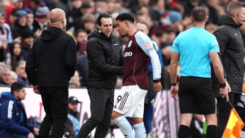 阿斯顿维拉的杰登·桑乔在对阵曼城的比赛中被换下后,显得十分沮丧。