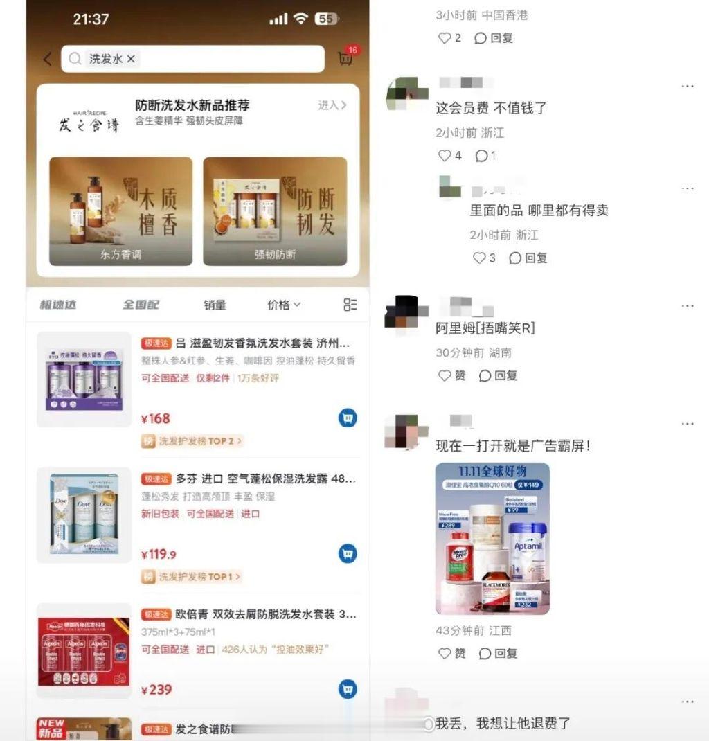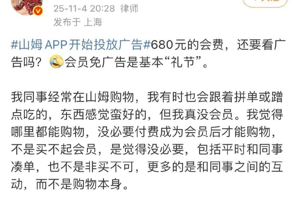 不少人认为,用户支付260元/年(卓越卡680元)会员费的核心诉求是无干扰购物体验,而广告植入则是双重复利,违背会员制契约精神。比如有网友表示:「山姆赚两份钱,吃相难看」「会员交卡费是为了看广告的吗?」当然,从上半年爆发的选品质疑,再到后来被质疑骑手把电瓶车当卡车骑车上挂满大件上热搜!山姆骑手把电瓶车快开成卡车了……,再到被质疑APP阿里味,山姆正在本土化这条路上越走越远了……