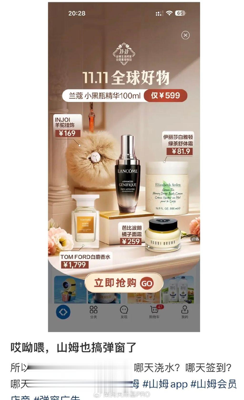 比如,山姆APP一开屏就有双十一弹窗广告。有网友表示,「哎呦喂,山姆也搞弹窗了!所以直接说吧,哪天抓猫?哪天浇水?哪天签到?哪天花呗?哪天借呗?」