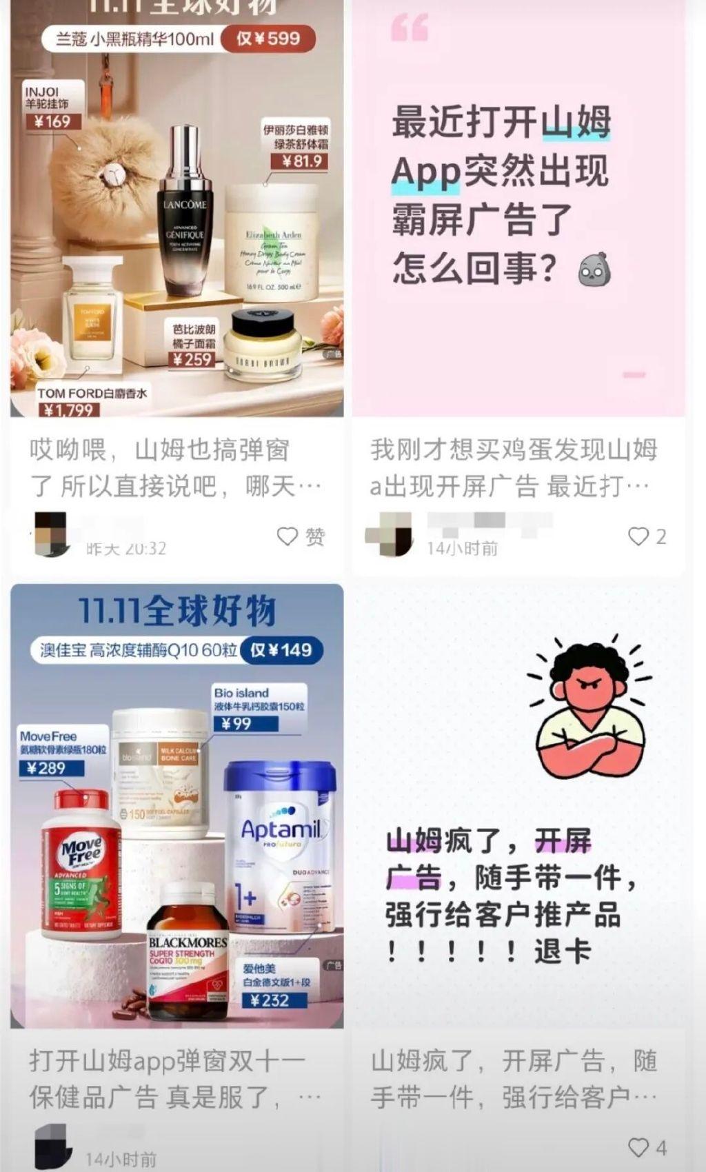 大概是,这两天,不少用户在社交媒体上吐槽山姆APP也开始投放广告给用户推荐品牌了,而且广告类型多样。