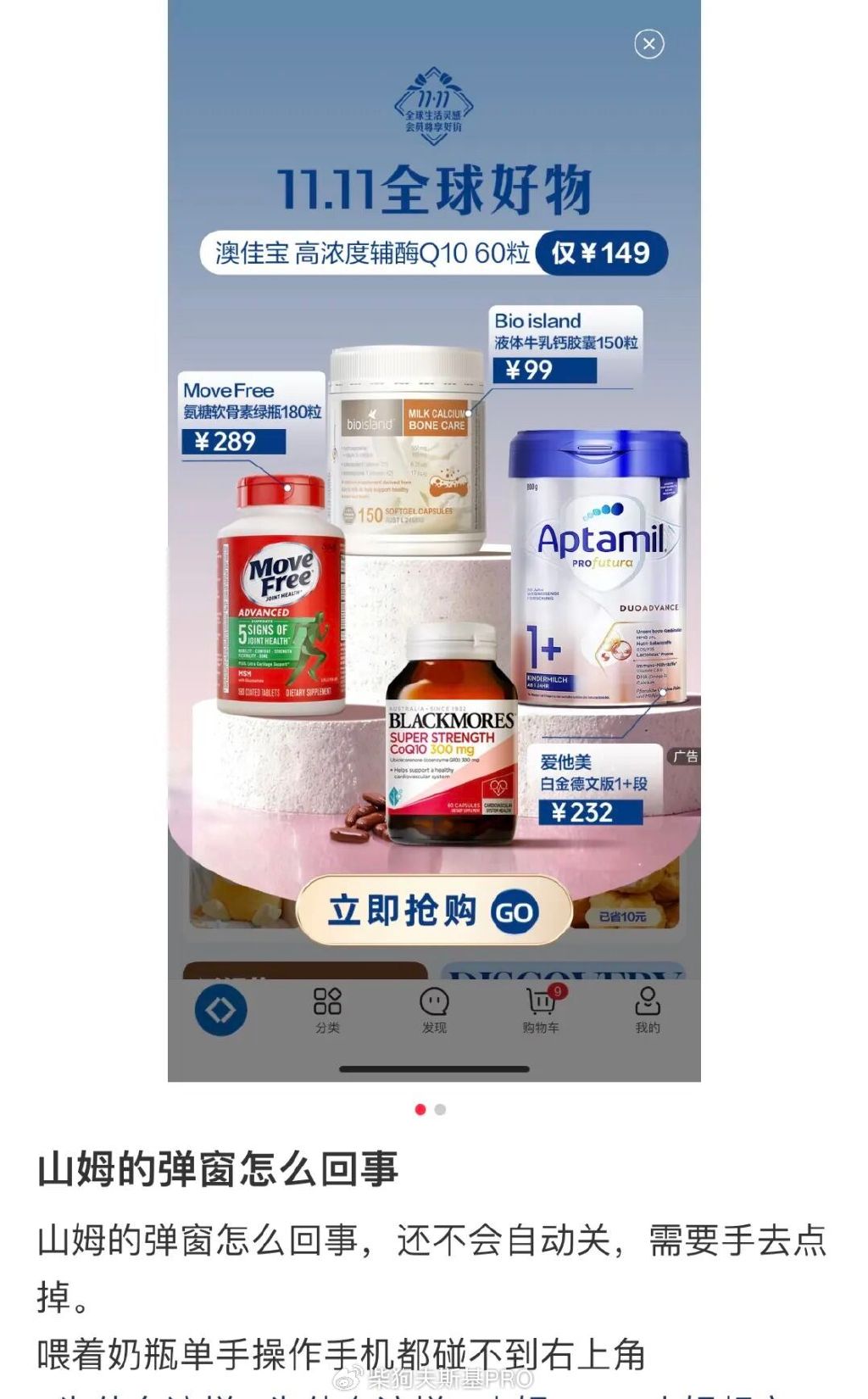 还有网友表示:「山姆的弹窗怎么回事,还不会自动关,需要手去点掉。喂着奶瓶单手操作手机都碰不到右上角」