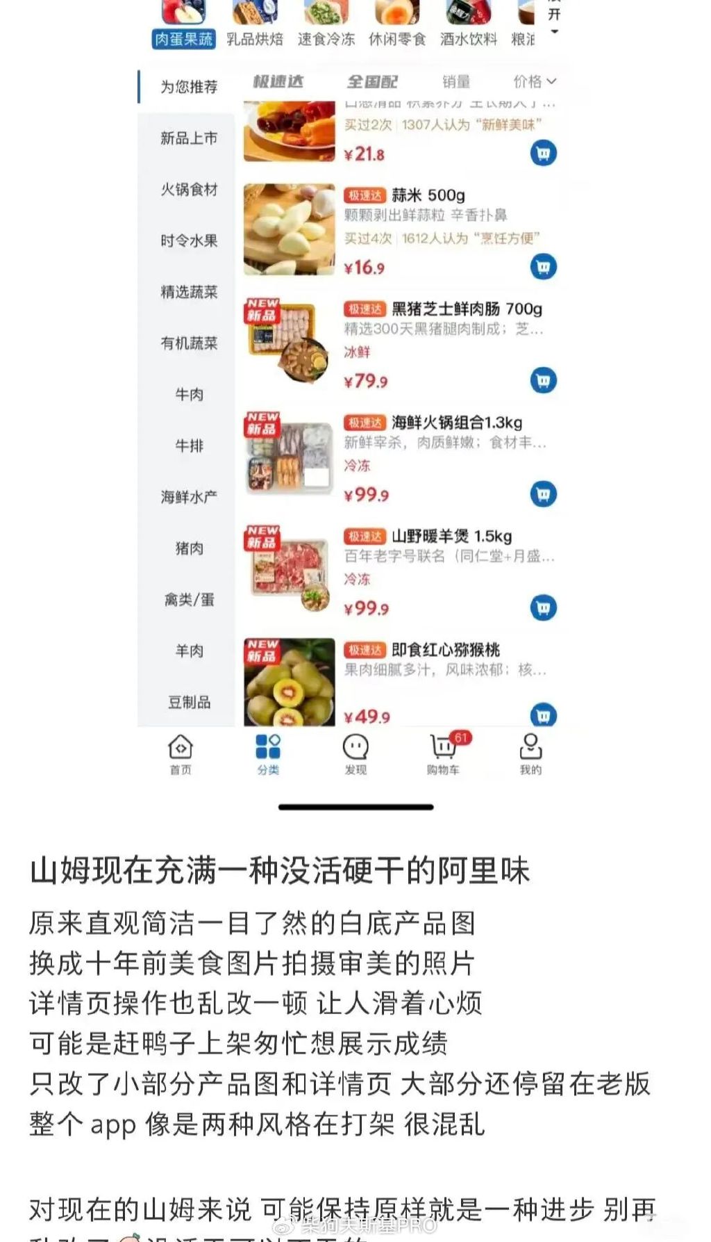 这两天,关于阿里巴巴原高管接管山姆后,山姆APP商品展示把原来所见即所得食材原拍的图,换成了精修美图,甚至做好的菜,被吐槽阿里味越来越浓了!