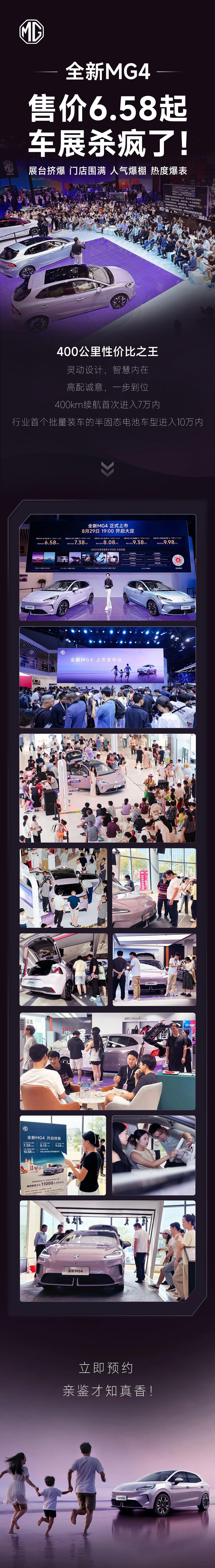 6.58万元给437km续航,全新MG4简直“无敌”如今的代步车市场,尤其是十万元以下的两厢纯电代步车市场,随便找都是一“爆款”,比亚迪、吉利两家几乎占据半壁江山,因此想要出彩,那答案只有一条路:给出无法拒绝价格和价值优势,全新MG4也确实是这么干的。预售阶段短短24天,全新MG4订单超过45000台,也证明了它确实有实力。 ⭐限时补贴价6.58万元-9.98万元,还有至高27000元的权益,这个价格几乎是在制造成本线上拉扯,效果自然立竿见影; ⭐如今这片细分市场,入门版续航300km出头几乎是共识,全新MG4则有点不讲武德,直接把中高配存在的437km放到入门版上,顶配直接530km,还不到10万元的价格,更长的续航里程确实对用户而言有绝对吸引力; ⭐4395×1842×1551mm,轴距2750mm,还有CTB电池车身一体化技术,A级车的尺寸,93.8%的空间得房率,空间几乎是天花板级别,体验的提升也能很轻易被感知到; ⭐智能化也基本拉满了,这个价位段给15.6英寸大屏、8155本身就不容易,再加上OPPO智行手车互联功能,支持华为、苹果、安卓等主流手机操作系统,智能化带来的便捷、娱乐体验也是有明显优势的; ⭐再看看配置单,全系标配6扬声器音响系统、LED大灯,中配车甚至给方向盘加热、电动尾门、氛围灯,高配也有智能拨杆变道 多场景智能泊车 高速NOA领航辅助驾驶,基本“拉满”了MG展台爆了