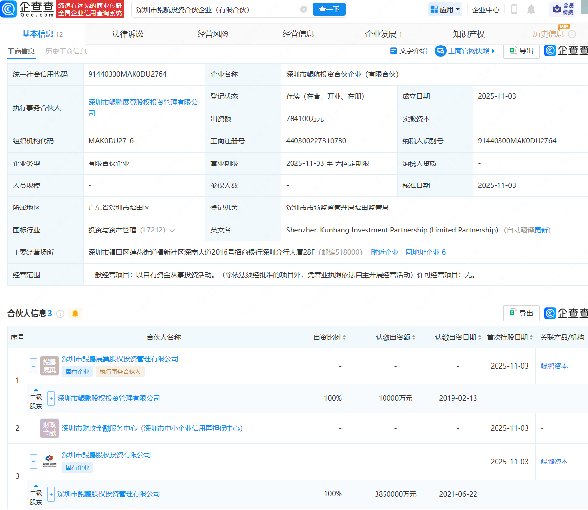 企查查APP显示,近日,深圳市鲲航投资合伙企业(有限合伙)成立,出资额78.41亿人民币,经营范围包含:以自有资金从事投资活动。企查查股权穿透显示,该合伙企业由深圳鲲鹏资本旗下深圳市鲲鹏展翼股权投资管理有限公司、深圳市鲲鹏股权投资有限公司,及深圳市财政金融服务中心(深圳市中小企业信用再担保中心)共同出资。