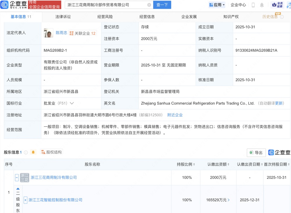企查查APP显示,近日,浙江三花商用制冷部件贸易有限公司成立,法定代表人为陈雨忠,注册资本2000万人民币,经营范围包括制冷、空调设备销售,机械零件、零部件销售,模具销售等。企查查股权穿透显示,该公司由三花智控(002050)旗下浙江三花商用制冷有限公司全资持股。