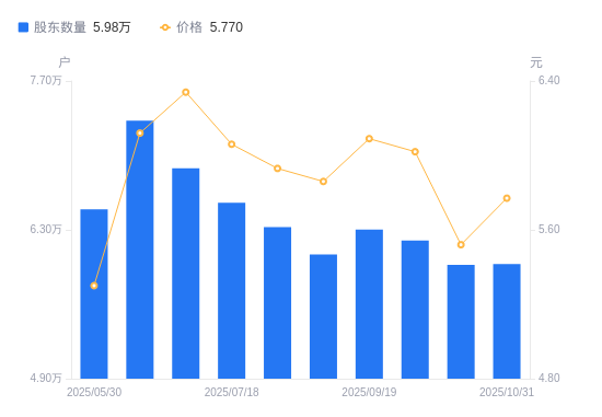 日期A股户数(户)流通A股户均持股数(股)户均持股市值(万元)2025-10-315979112288.237.092025-10-205970312306.346.792025-09-306198911852.527.142025-09-196302111658.437.102025-08-296068312107.607.102025-07-316324511617.136.892025-07-186553911210.516.792025-06-306879910679.316.772025-06-107326910027.786.142025-05-306492811316.016.00