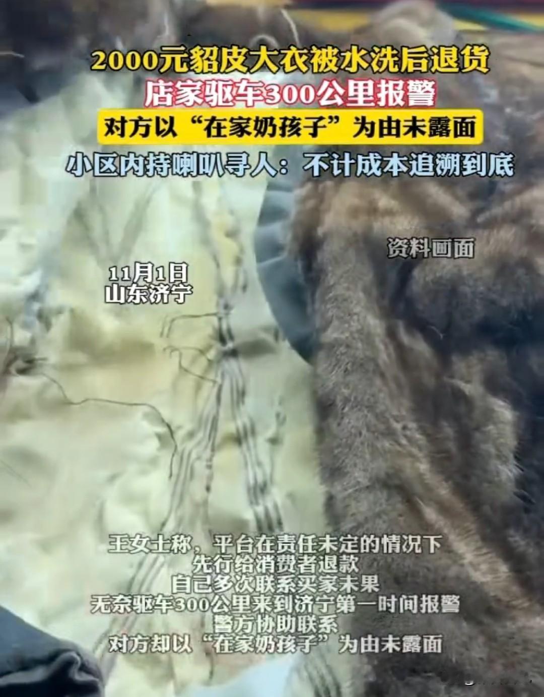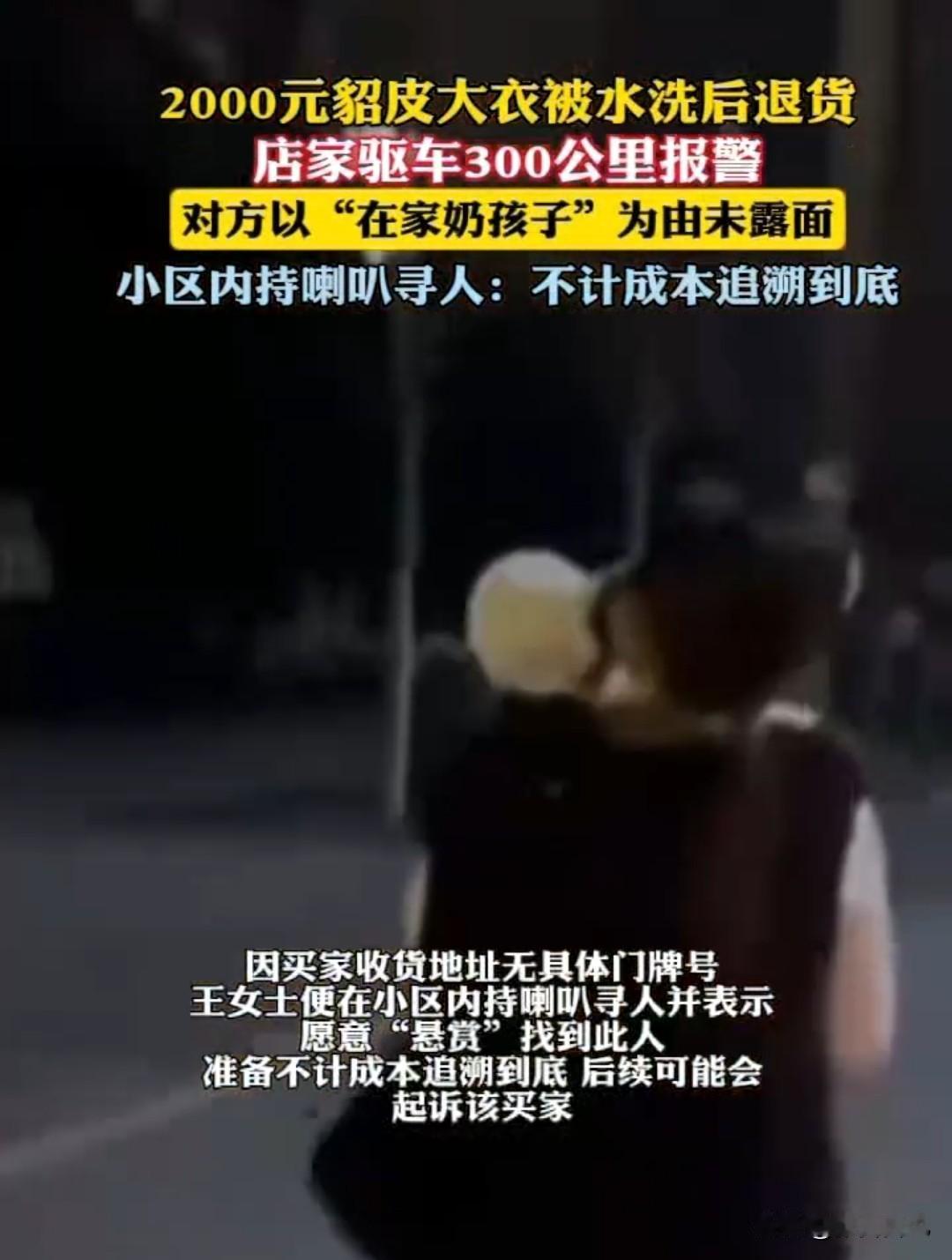 想买真貂皮大衣吗?找这位店主就对了。 近日,一位网店店主收到一单退货:价值2000元的貂皮大衣,被顾客水洗后退货了!店主气炸了:你可以七天无理由退货,但不能水洗后退给我! 看着水洗后成了硬如塑料般的大衣,店主怒从心头起:这位顾客买了貂皮大衣后四五天申请退款,本以为不会影响第二次销售,正常人都会把衣服的吊牌什么的都保留好,可这位顾客倒好,直接水洗。 更惨的是,平台在没有确定哪方责任前,就已先行给顾客退了款,现在自己多次和顾客联系,对方拒绝沟通,没奈何,店主只得开车三百公里,来到济宁,并第一时间报了警。警方人员也帮忙一起联系这位顾客,谁知,顾客给了一个让人啼笑皆非的理由:要在家奶孩子,没时间见面。 店主没办法,因为顾客的收货地址没有具体到门牌号,她只得在顾客小区内拿着喇叭寻人,并表示愿意悬赏找到此人:不计成本,坚决找到这位买家! 有网友表示:这绝对是真貂皮啊,不然哪值得店主开车300公里跑去找人呢?并赶紧问:姐,你店子在哪里,我去买! 有人猜测,估计是死要面子吧,想穿貂皮大衣参加喜宴,准备回去就退,没想到吃饭时弄脏了,又不知道不能水洗,想着2000块不能自己亏了呀,直接就退了货了。 也有网友支招:给小区快递店或驿站给点小费,就可以通过监控查人了。这倒是个好主意呢。 为啥还有这种人呢?笔者要是有退货,不光东西要原样封好,就是里面的小卡片都全部退回去,要是是衣服啥的,还得按原来的折痕给折好,生怕店家生气不给退款了,看我这老实孩子。 有做过网店的网友都想哭:有一家人买了童装,去年买的,今年还要退,因为孩子大了,衣服小了,这,可以说无语两个字吗? 这顾客到底是啥心态呀?是不知道貂皮大衣不能水洗还是真是弄脏了故意退的呢?你不喜欢,退了,大家都能理解。可水洗了还退,就不能理解了哟。 现在赚钱都不容易呀,多替别人想想,别光想着自己亏了两千,人店主也不容易啊,这现在闹得整个小区人尽皆知了吧,是不是经常退换货的,所以不敢留详细的门牌号呀? 建议以后平台在有大额退货纠纷时,不要先行垫付,毕竟这个时候责任真不好说是店家的呢,万一不是店家的,岂不是让店家要平白承担这种无妄之灾呀?