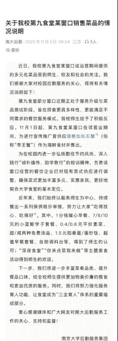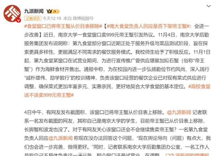 南京大学食堂推出 999 元帝王蟹后迅速下架,如何看待此事?奢侈菜品应该出现在大学食堂吗? 新京报讯 11月4日,南京大学后勤服务集团针对网传“南大食堂推出999元帝王蟹”发布情况说明。全文如下: 内容来源 ------------------------------------ 明码标价,不强制消费即可。学校既有帝王蟹窗口,也保留了普通的平价菜品窗口,于学生而言并没有失去什么。 学校愿意尝试多元化的菜品,虽说有盈利的想法在里头,但一定程度上也是在改善服务质量,学生喜闻乐见,有更多的选择。 据悉,该食堂的海鲜档口除了999元1只(4.2斤)的帝王蟹,还有158元1只的波士顿龙虾、68元1条的石斑鱼可供选择。 至于有网友说的这种做法涉嫌有道高消费,大学生都是成年人,丰俭由人,有钱想吃可以买了尝个鲜,凑几个同学一起买分摊一下费用也可以,真没必要上纲上线。 小查发现,南京大学曾于今年8月发布仙林校区九食堂委托加工合作管理服务项目公开遴选公告。 公告称为进一步丰富学校菜肴品类,全面提升伙食质量,充分满足师生日益增长的个性化饮食需求,采购人决定对仙林校区学生第九食堂进行公开遴选,选择1家餐饮公司负责仙林校区第九食堂整体委托加工合作管理,所有窗口由中选单位自营(不包括装修项目及直营的连锁餐饮品牌等)。 11月4日,南大后勤发了情况说明,除了高价菜品,食堂也有1分钱暖心早餐、7/8/10元的小蓝鲸学子套餐、0.4/0.8元平价素菜、甜/咸两种免费汤品、1.5元阳春面/蛋炒饭、超值早餐套餐、自助调料台等。 另据媒体报道,目前帝王蟹、长脚蟹和波龙已经被从价目表上移除了,至于后续是否还会继续卖,食堂负责人表示暂时不方便回答。