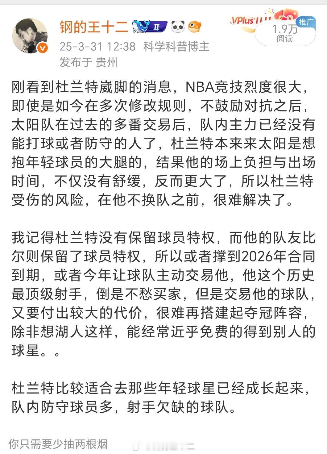 杜兰特在火箭就可以打“养生篮球”,也享受一下不需要防守的待遇。