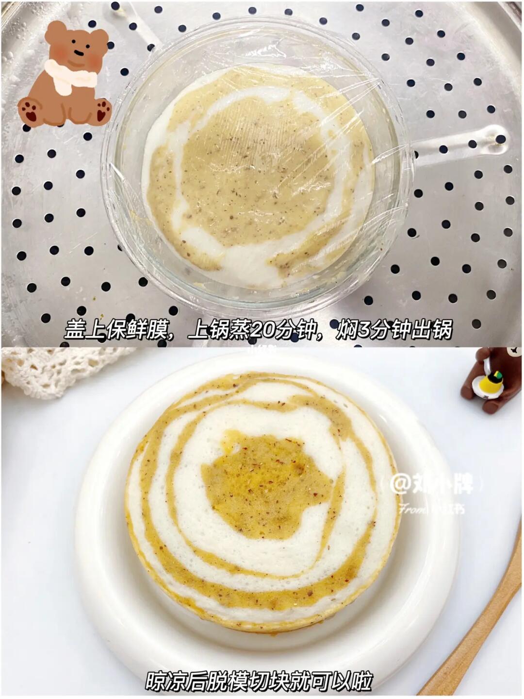 ⚠️食材的配比和详细的做法都详细的给到了,山药要用铁棍山药,不然打发不起来。打发的时间也要够,断断续续的3分钟左右就可以,打发好的状态是蓬松的糊状。如果担心不成形,可以在两种蒸糕糊里各加5g面粉,口感也是差不多的。