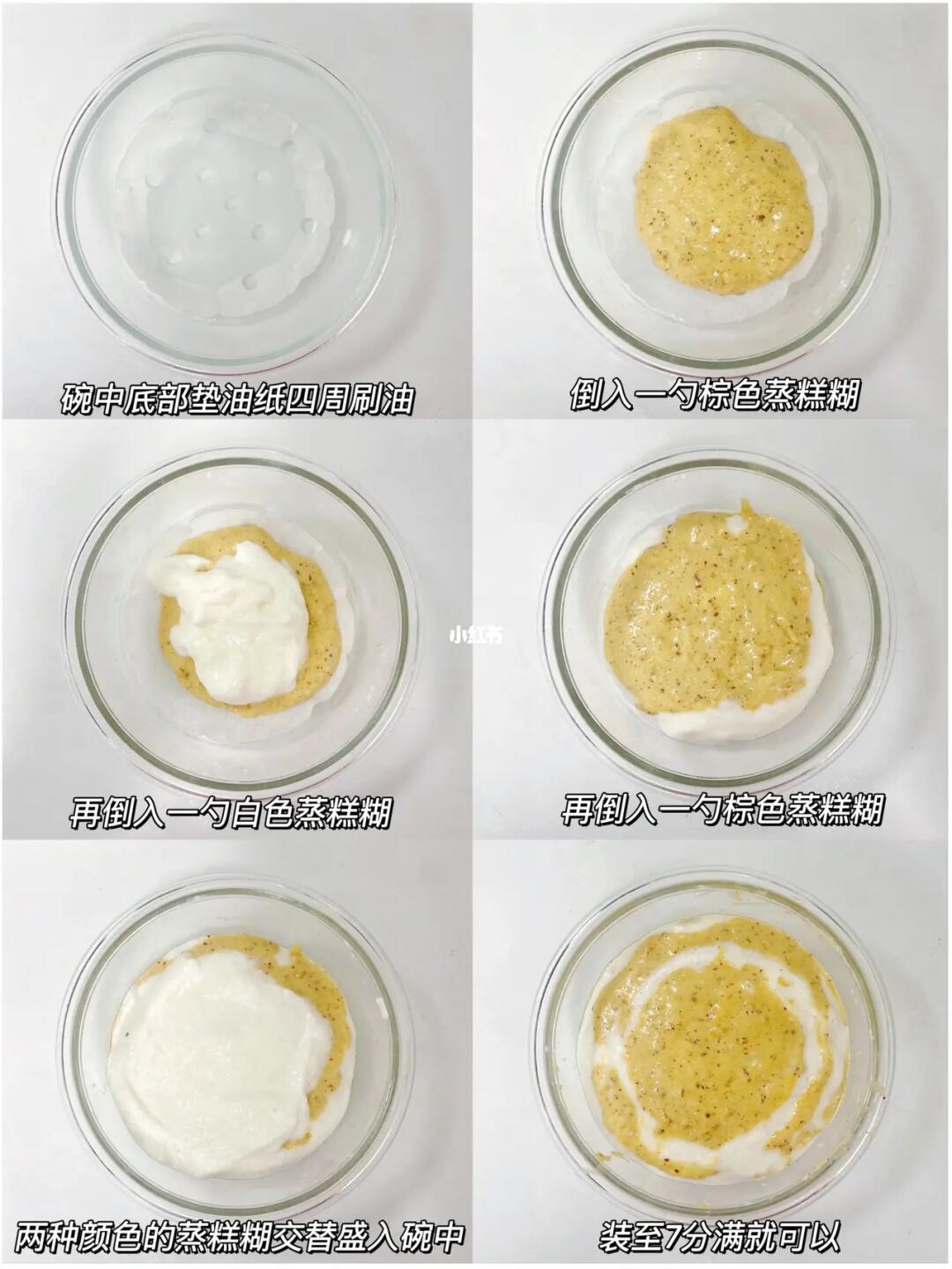 4⃣️蒸糕容器底部垫油纸,四周刷油。按如图所示顺序,交替倒入两种准备好的糊糊。