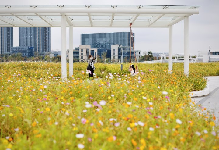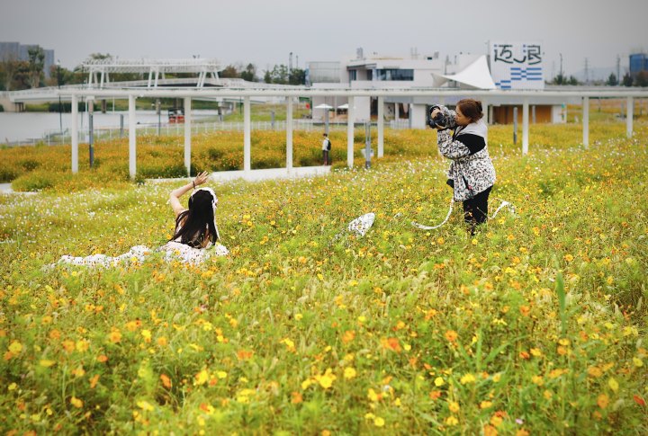 近段时间,钱塘区江海之城的东沙湖公园内,3万多平方米的波斯菊在社交平台“火出了圈”。
