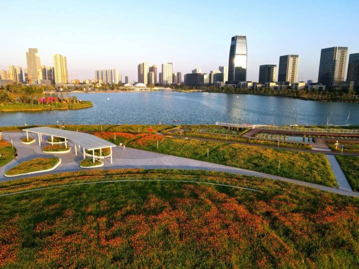 在植物设计上,东沙湖公园注重生态性与观赏性相结合,采用精品植物组团和群落式种植,形成野趣盎然的田园新城风貌。