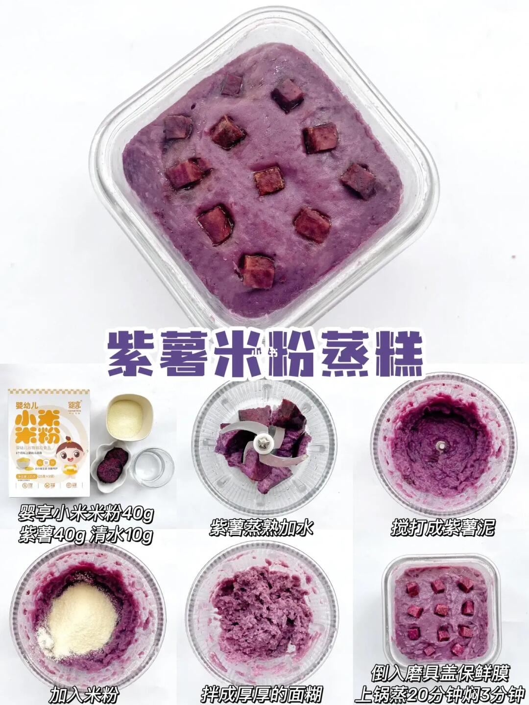 ▪️食材:紫薯60g(紫薯蒸熟加清水约10g打成泥)、婴享小米米粉30g