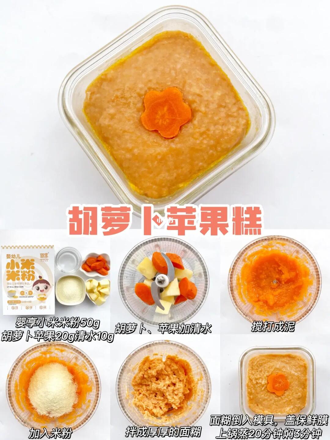 ▪️食材:胡萝卜20g(胡萝卜、苹果加清水约10g打成泥)、苹果20g、婴享小米米粉50g