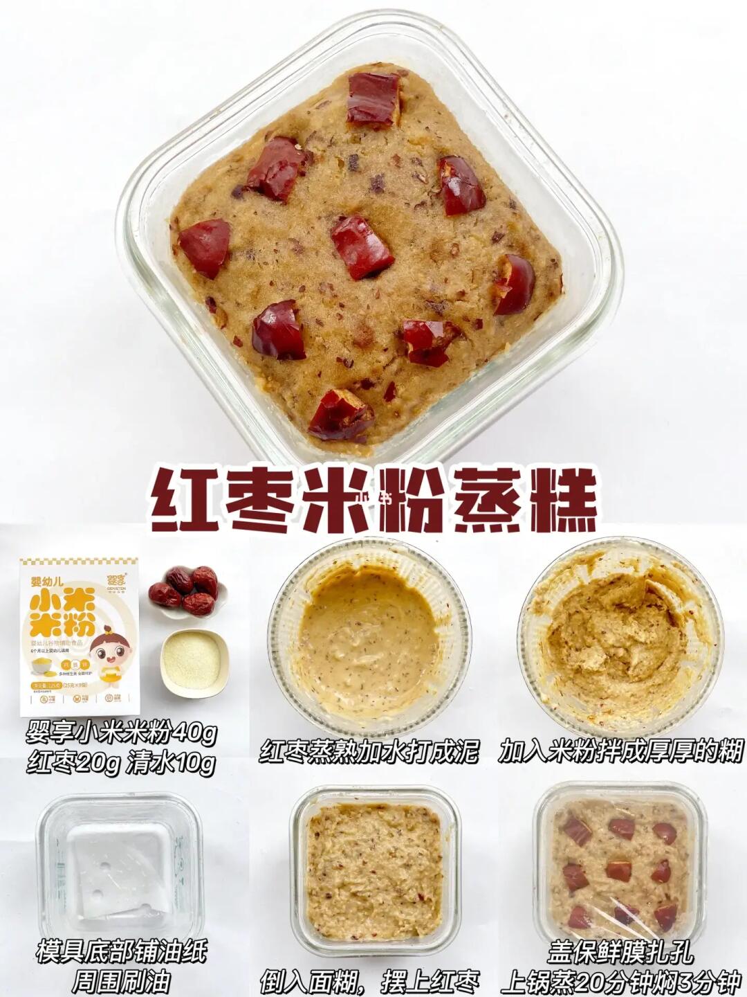 ▪️食材:红枣20g(红枣蒸熟去核加清水约10g打成泥)、婴享小米米粉40g