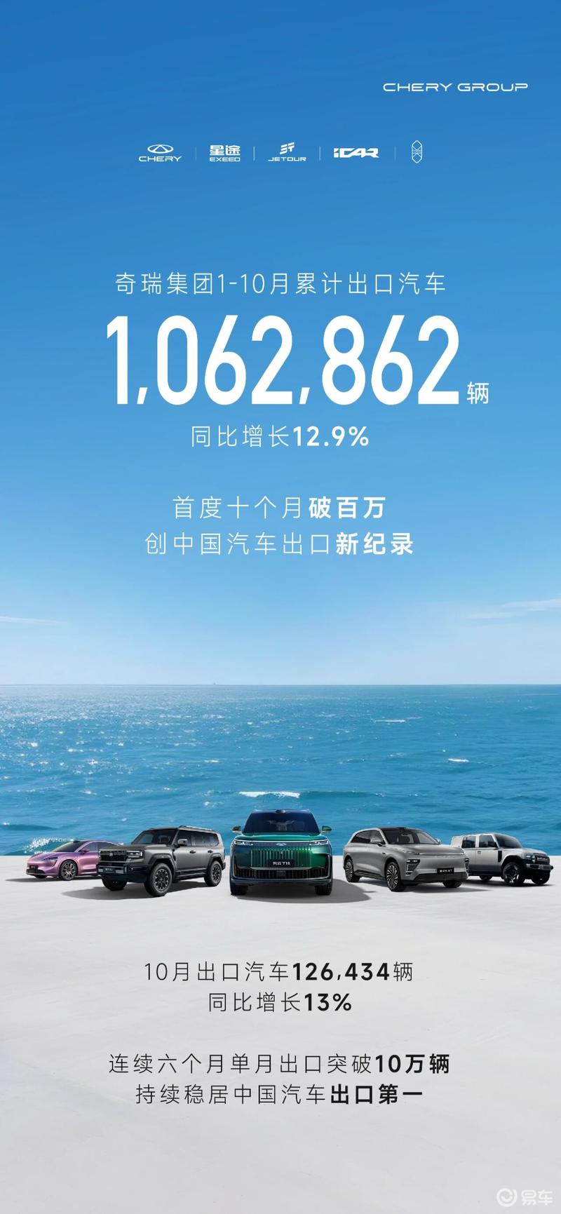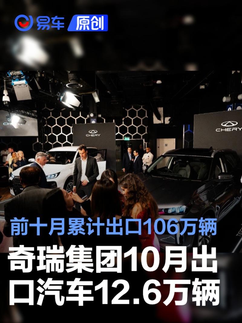 易车讯1-10月,奇瑞集团累计出口汽车106万辆,同比增长12.9%,以历史最快速度达成年内出口百万辆,刷新中国汽车出口新纪录。目前,奇瑞集团全球累计汽车用户突破1800万,其中海外用户超过556万,全球化战略迈入高质量发展新阶段。
