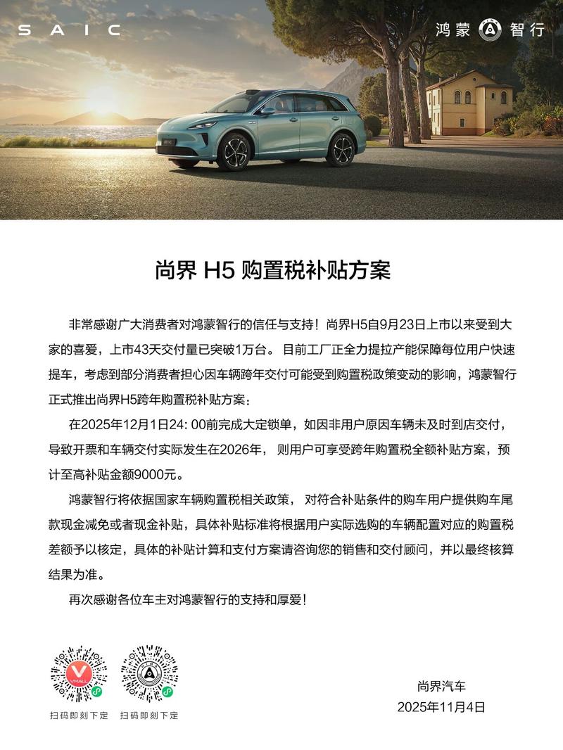 易车讯11月4日,鸿蒙智行官方宣布尚界H5上市43天交付突破10000台。同时,官方推出全新限时权益,12月1日24:00前完成大定锁单可享至高43588元限时权益,及至高9000元跨年购置税全额兜底。