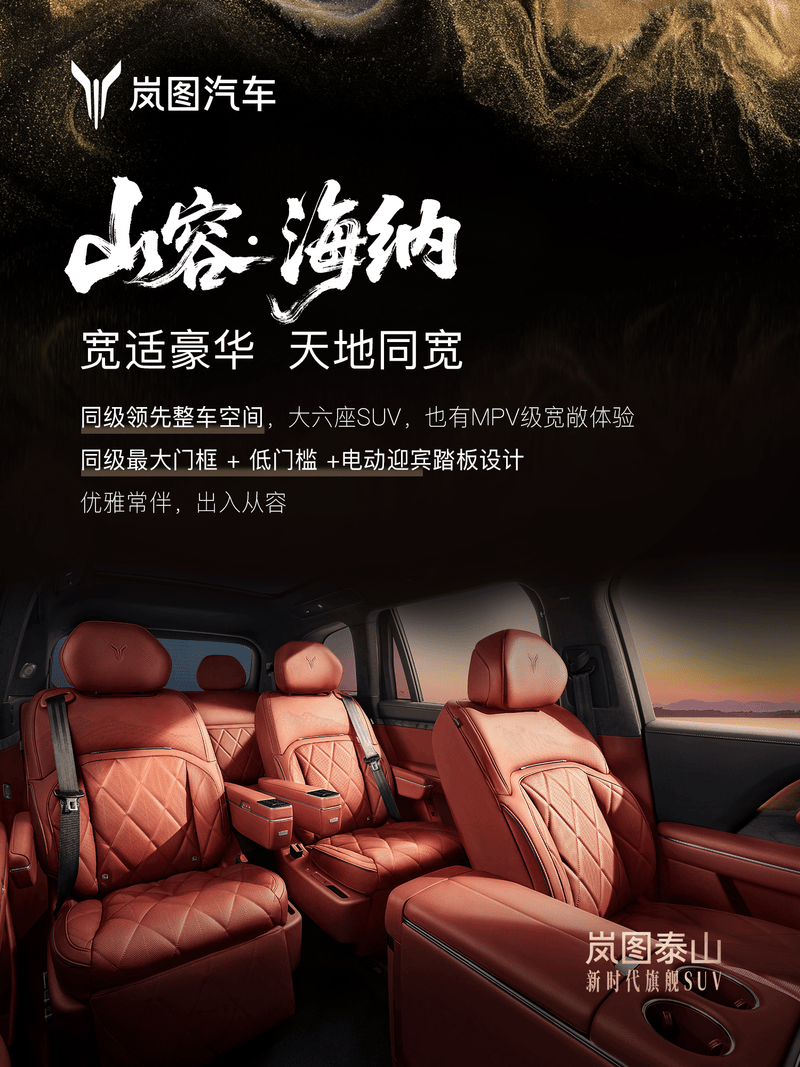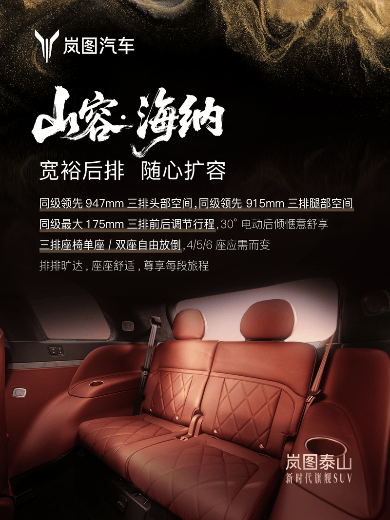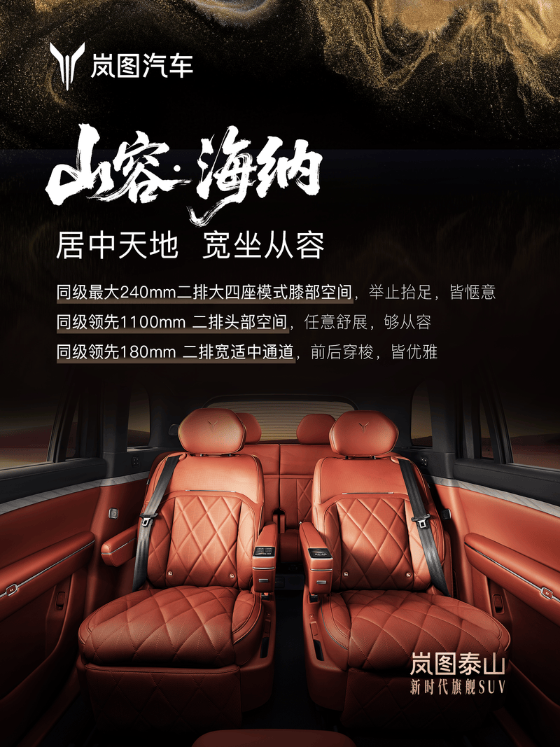 据官方介绍,岚图泰山拥有1070mm前排头部空间,前排乘坐宽度达1494mm。二排大四座模式下的膝部空间达240mm,二排头部空间达1100mm,二排中央通道宽度达180mm。此外,新车三排头部空间达947mm,三排腿部空间达915mm。三排前后调节行程达175mm。同时,新车三排座椅支持单座/双座自由放倒。