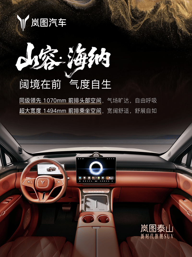 座舱设计上,岚图泰山从中国山水意境与传统建筑中汲取灵感,以“山水入境”为核心,强调舒适内饰与用户情感共鸣,采用温润雅致的材质与色调,营造出如置身自然画卷的静谧氛围,首批推送最新版鸿蒙座舱语音大模型。方向盘的设计也颇有质感,上面有镀铬装饰和金属质感的滚轮按键。