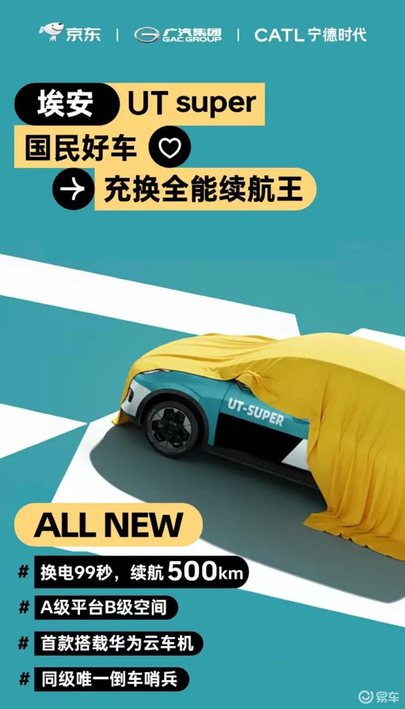 易车讯11月4日,我们从官方渠道获悉,由广汽、京东及宁德时代三方联合打造的埃安UTsuper车型将于11月5日下线。该车搭载宁德时代巧克力换电块,拥有500km的续航里程,并支持99秒极速换电。